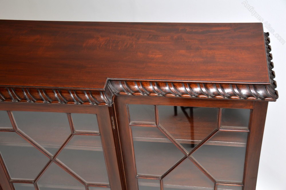 It has a spectacularly scalloped out & carved top edge, which is very distinctive & it sits on ogee bracket feet. There are four astral-glazed doors all of which can be locked. The inside bookshelves are all adjustable within the three separate compartments.