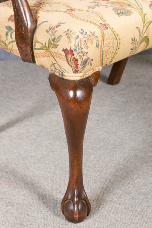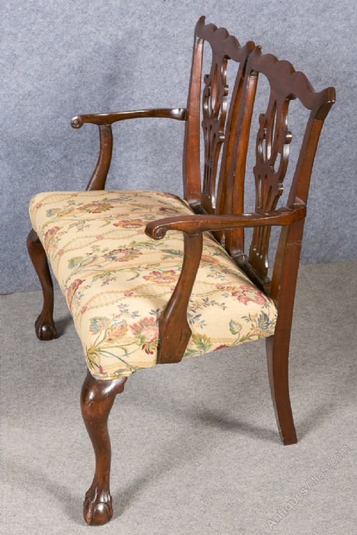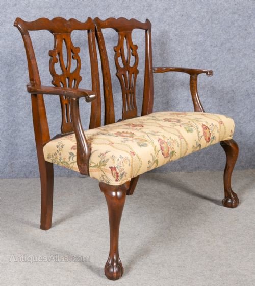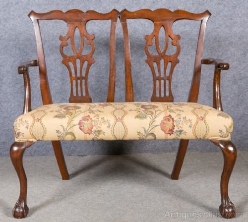 A 19th.Century mahogany Chippendale style double chair back settee with open arms, shaped and pierced splats and standing on cabriole legs with claw and ball feet. The floral upholstery in good serviceable order and ready for use in the bedroom, hall or lounge. Sizes:- Max.height...36''/91.5cm. Width...39''/ 99cm. Depth...21''/ 53cm. Seat height...18''/ 46cm. Delivery to most of U.K. mainland £55.