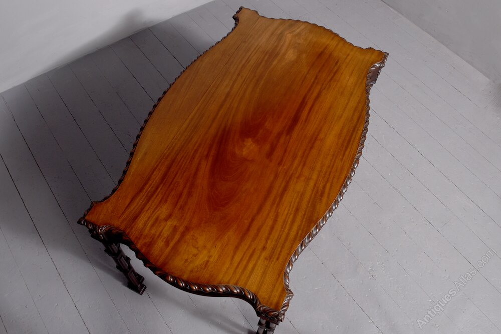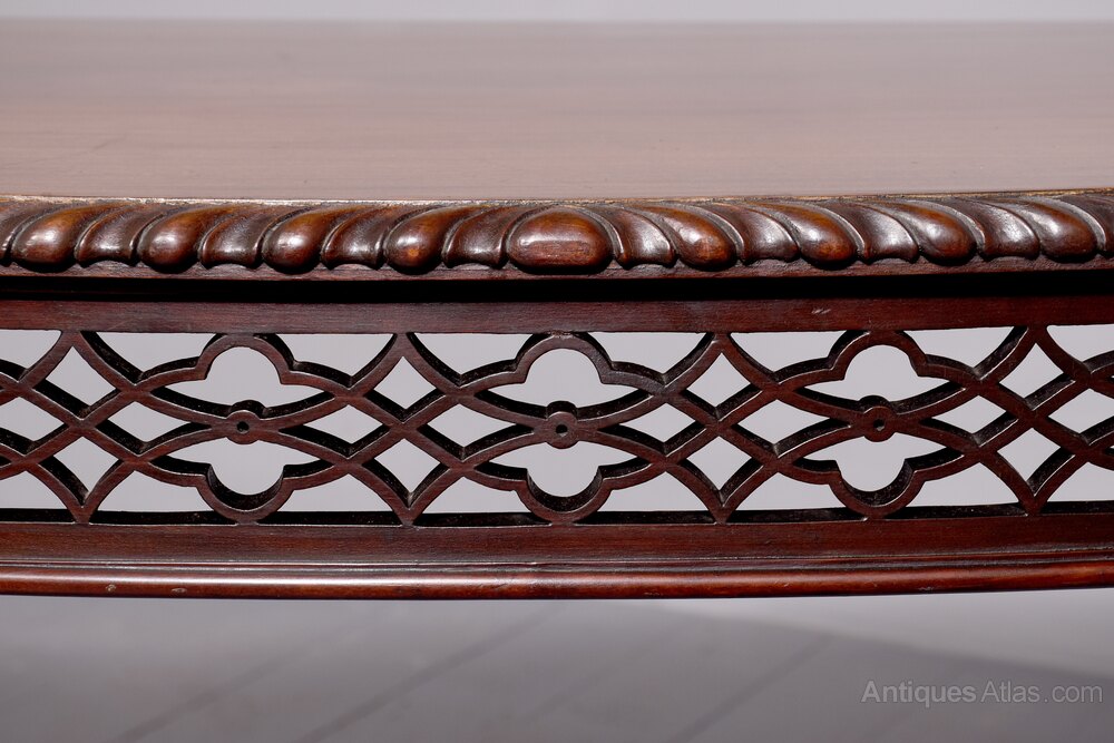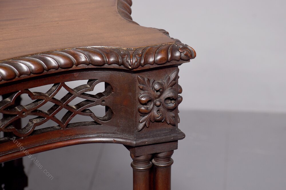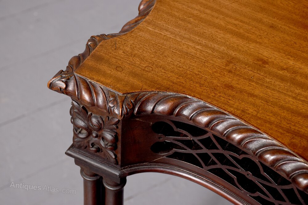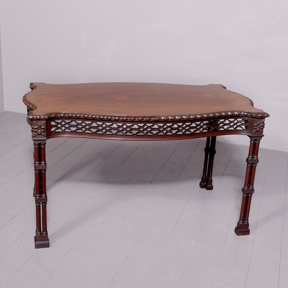 Circa 1880 An elegant Chippendale style mahogany freestanding table, the solid shaped top in finely figured mahogany with a well carved dragooned fore-edge intersected with floral carvings with small breakfront ends, the elaborate pierced frieze which follows the form of the top, each corner headed by a well carved flower-head with simple beading beneath, the table stands on 4 cluster column legs, intersected by carved blocks all sitting on 2 tier platform foot.