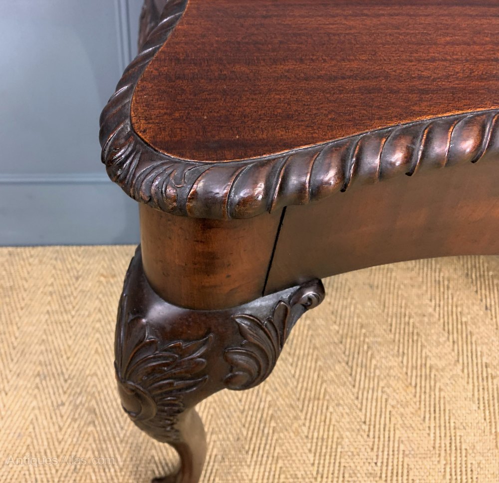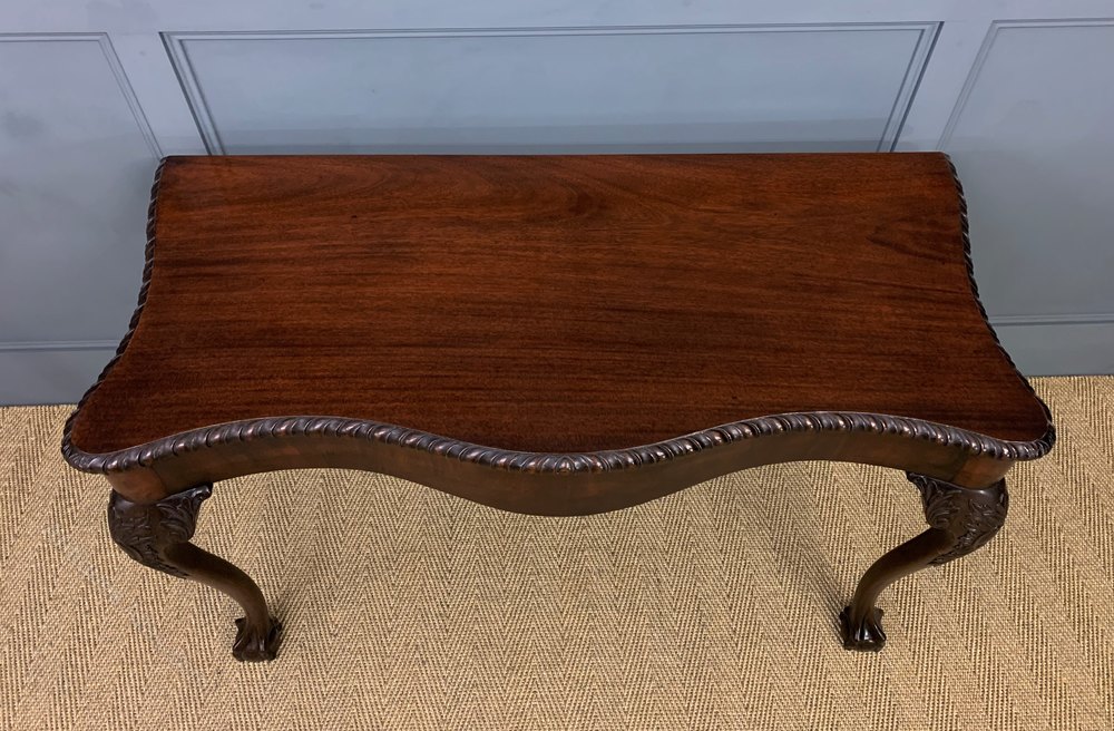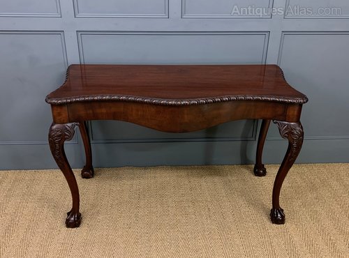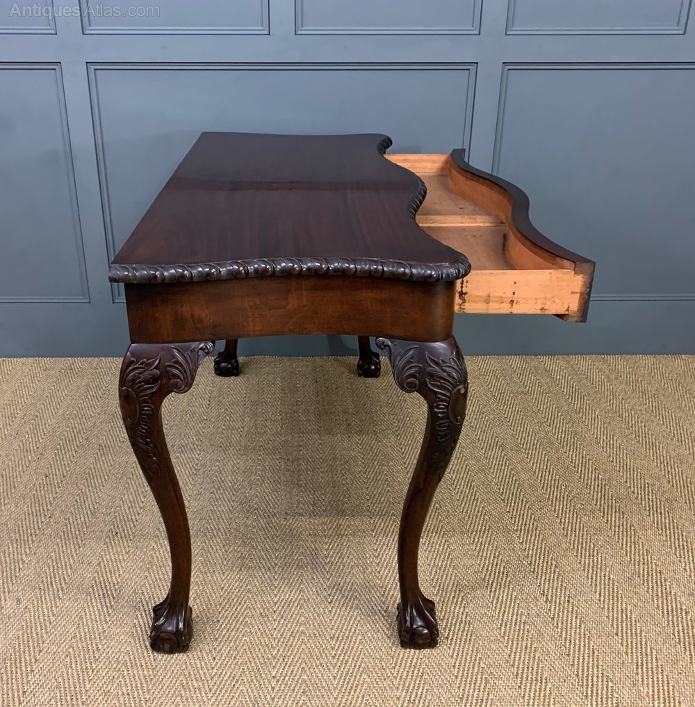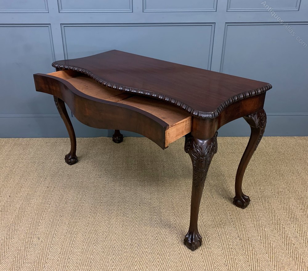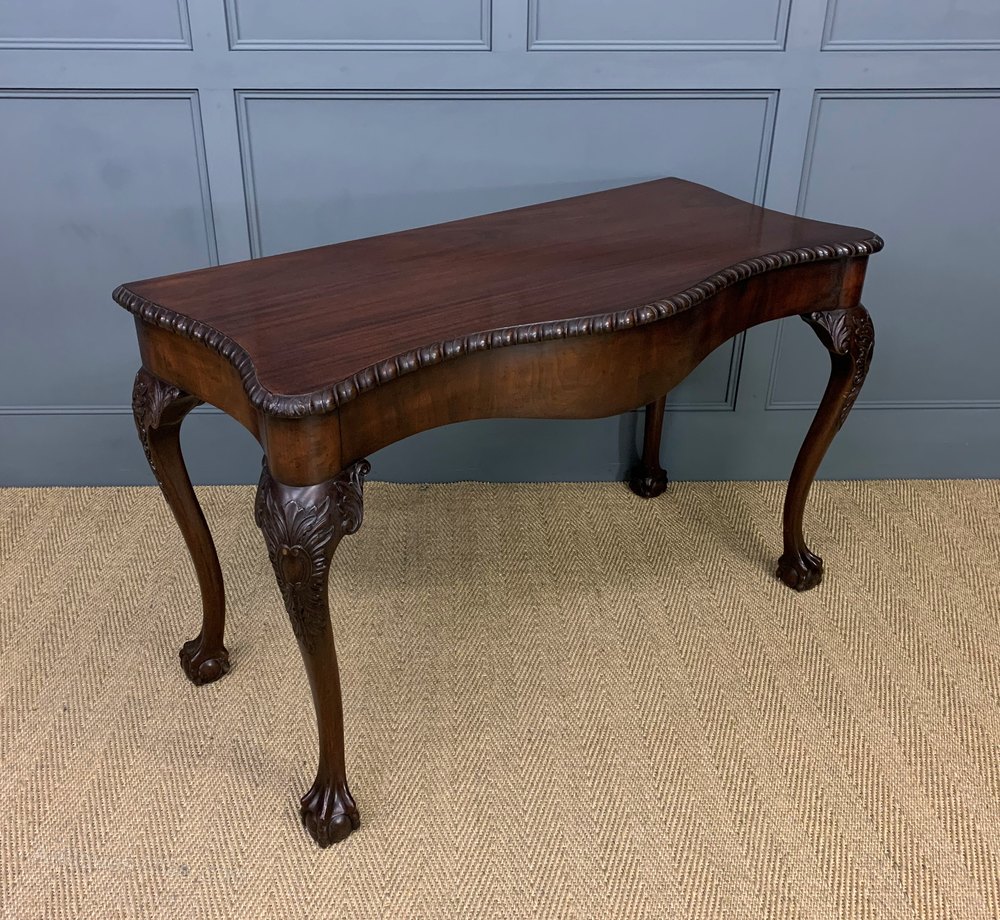 A good quality serpentine shaped mahogany table in the manner of Thomas Chippendale. Well made from a good grade of solid mahogany timber and attractive mahogany veneers. This table has a lovely bold serpentine shape and would function equally well as a console, side, serving, hall or lamp table. It stands well on bold cabriole legs decorated with carved detailing to the knees and terminating in characteristic ball and claw feet. The serpentine shaped top has a gadrooned edge and sits over a single long drawer. We have had this lovely table sympathetically repolished to a very high standard, it now has a great depth of colour and patina. It is offered for sale in excellent overall condition , ready to go straight into the home.