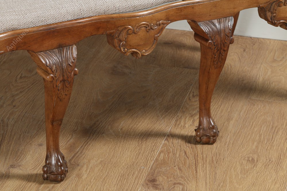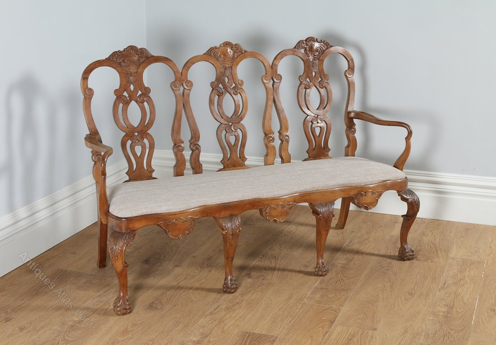 Here is a very good quality and unusual antique solid walnut settle, in the style of the Chippendale period, circa 1920, in excellent condition. The settle features a stunning quality carved back incorporating a triple shaped head rail with centered cartouches around a finely executed interlaced open fretwork back, with open splats that connect to the splayed arms. The settle features a drop-in seat, which has been newly upholstered in a top quality hard wearing taupe shade wool & cotton upholstery. The padded and webbed seat is firm but comfortable it does not sag. The seat sits in a serpentine shaped frame, which incorporates carved cartouches to the apron. Elegantly shaped cabriole legs that feature scroll acanthus leaf carvings to the knee of the legs, terminate on pronounced ball and claw feet on the front of the settle with sabre shaped legs to the rear. This item features a mellow walnut colour and has a fantastic colour and patination.
