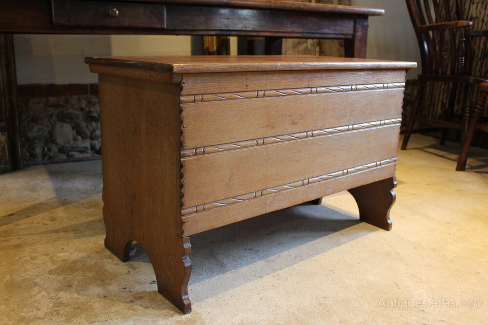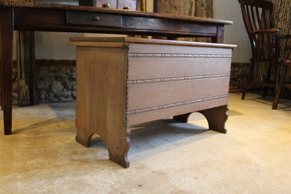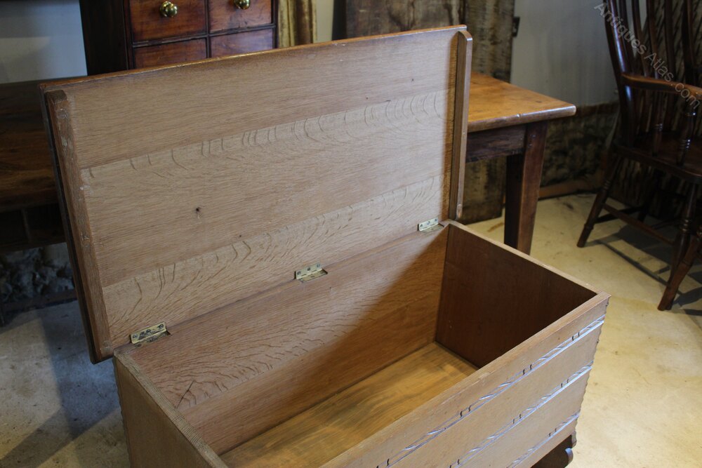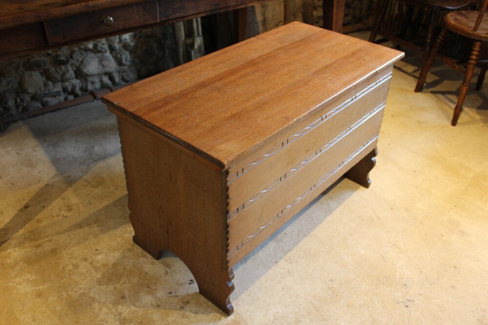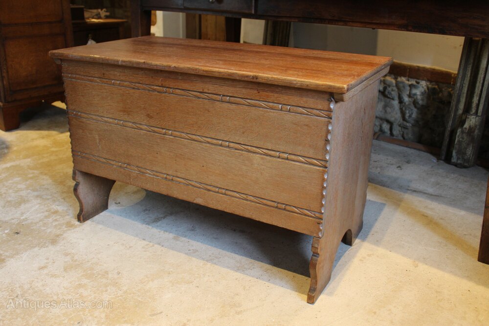 Here we have a rare and wonderful Cotswold school traditional plank coffer in the manner of Heals c1930. As you can see the chest has great limed Oak colour and patina. There is a thick plank top with super colour and grain. There are single planks to the front rear and sides. The front has very clever carving in the 17th century style. A super period chest in fantatic retail condition ready for your home. The dimensions are approx 90 cm wide 58 cm high 46 cm deep.
