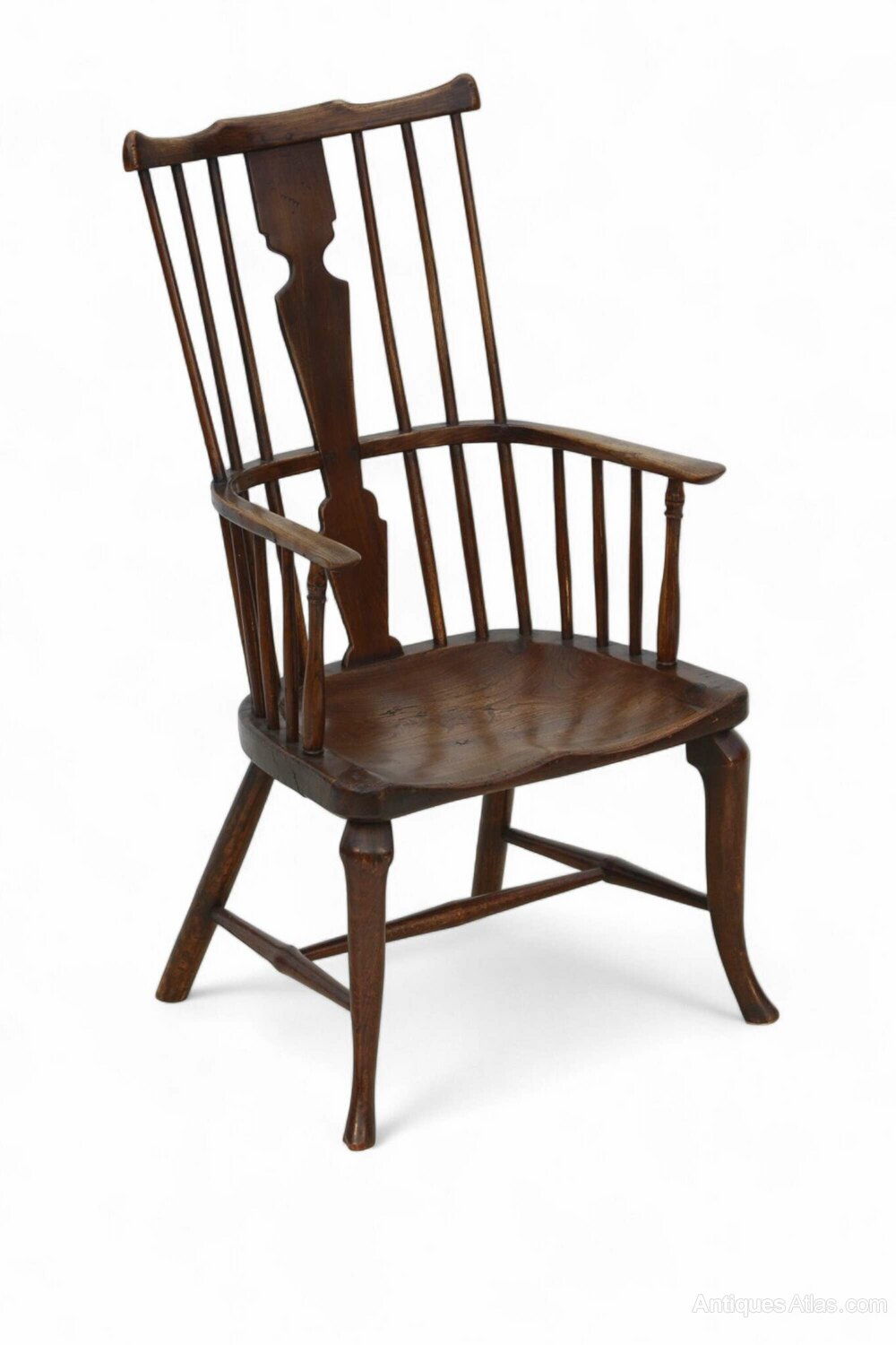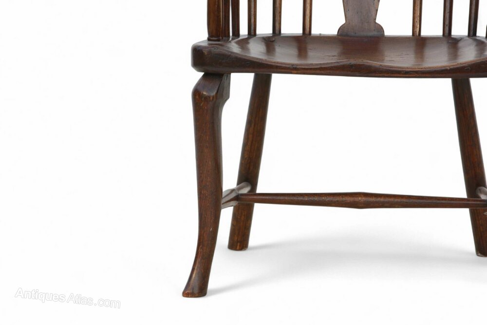 An elegant Windsor comb back armchair with blind central splat, slender cabriole legs with subtle knee detail, slender turned arm supports and H stretcher, in ash with elm seat. Thames Valley, England c1790.