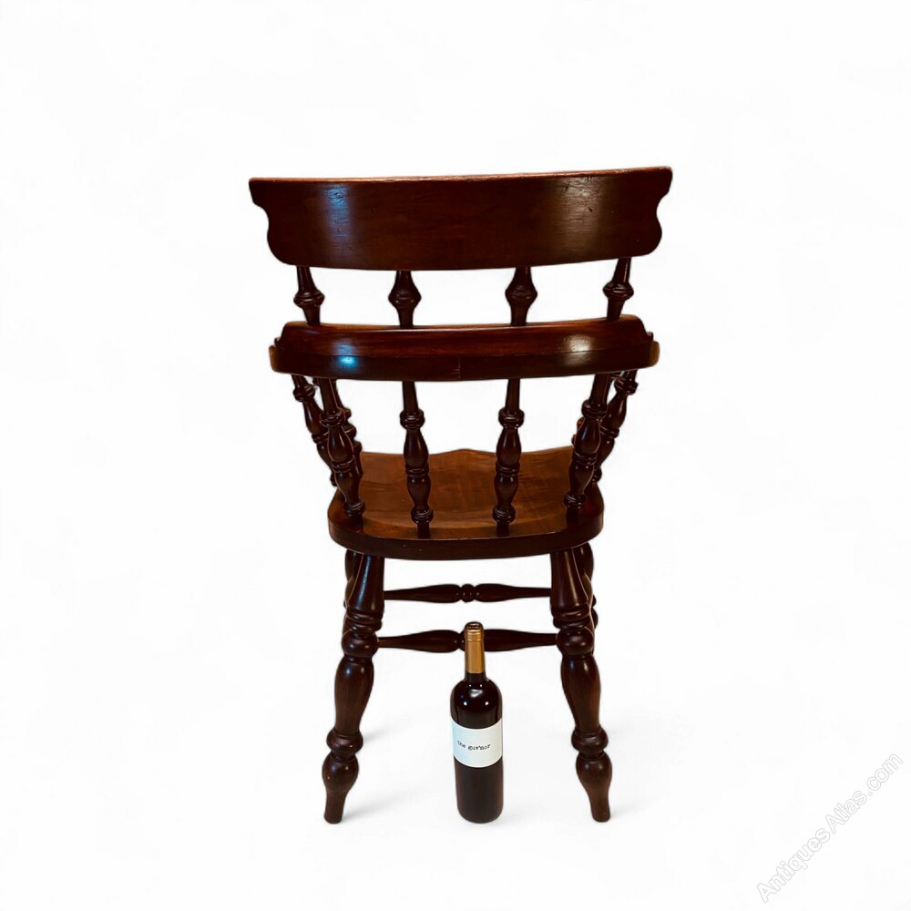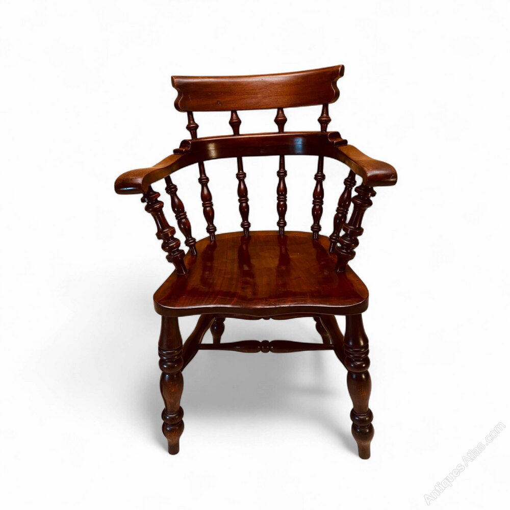 The most common form of captain’s chair features a low curved cresting rail above the arm bow whereas these chairs feature an unusual comb back top rail separated from the arm bow by turned spindles, echoing the design of the spindles uniting the arm bow to the seat.