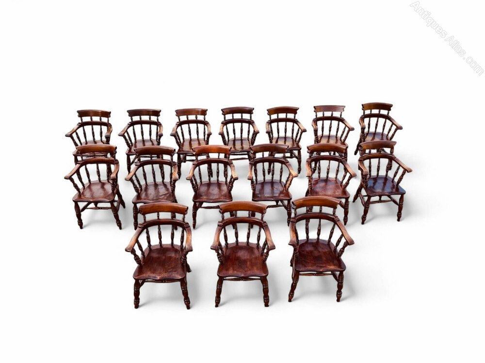 A true set of 16 generously proportioned and extremely comfortable Windsor style comb back captain’s chairs in ash, alder and elm c1900, Lancashire, England.