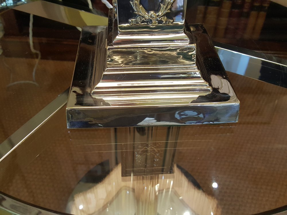 Early 20th century silver plated Corinthian column table lamp with stepped square base and laurel wreath decoration - The lampshade(s) are newly handmade silks by the same maker as provides the shades for Downton Abbey - all lights and lamps have been rewired with authentic corded flex, fitted with either foot switch or finger clicker switcth and are Pat tested 12"diam x 25"h