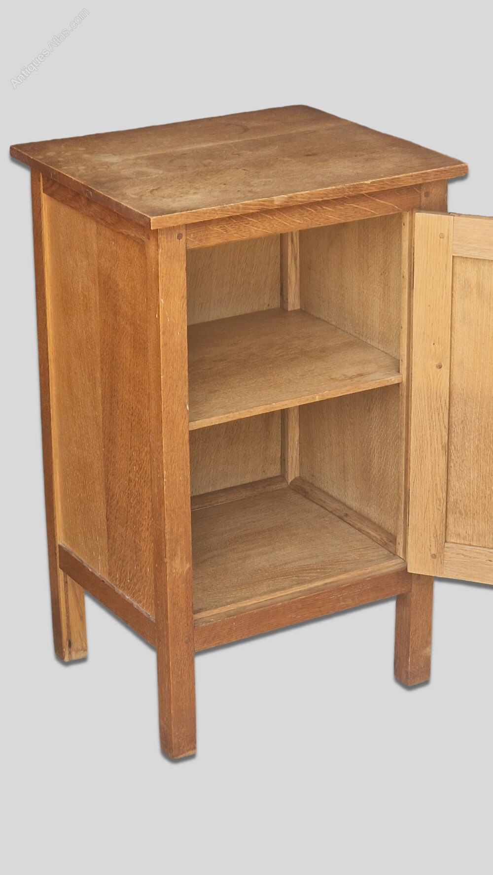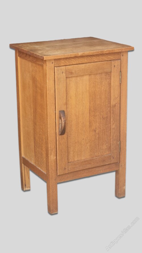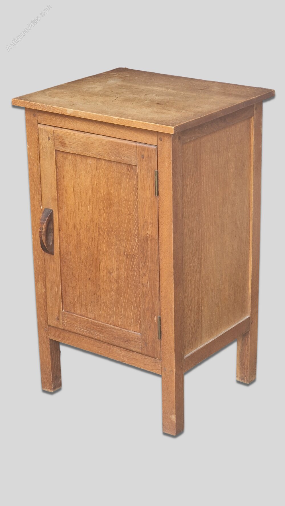 An Arts & Crafts Cotswold School oak side cabinet / lamp table. Unsigned but possibly Gordon Russell c.1925 - 1930. Constructed in well-figured quarter sawn oak, dowelled joints and original pinch handle.