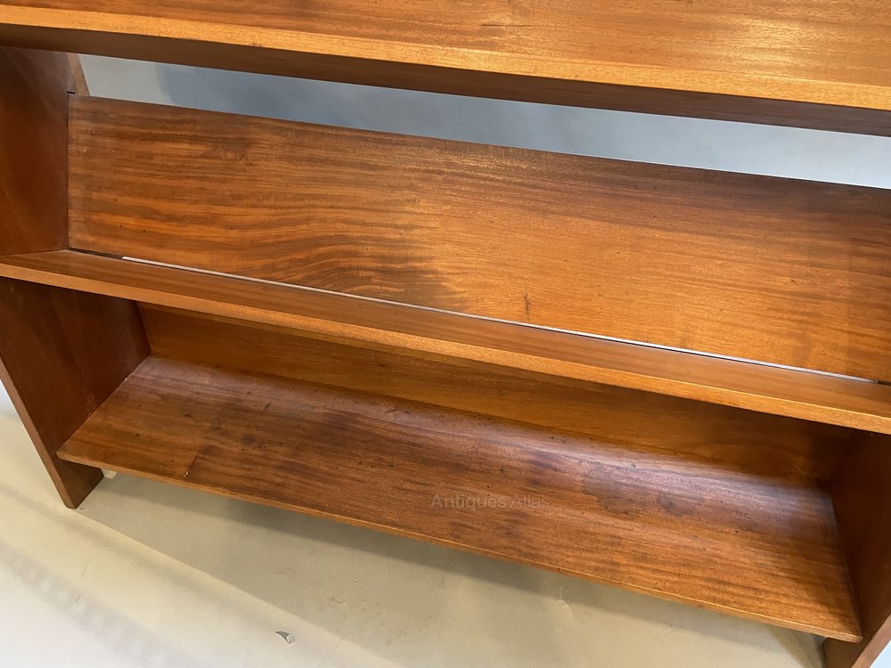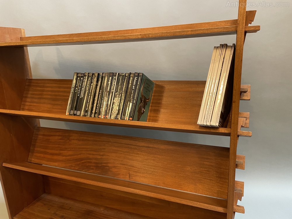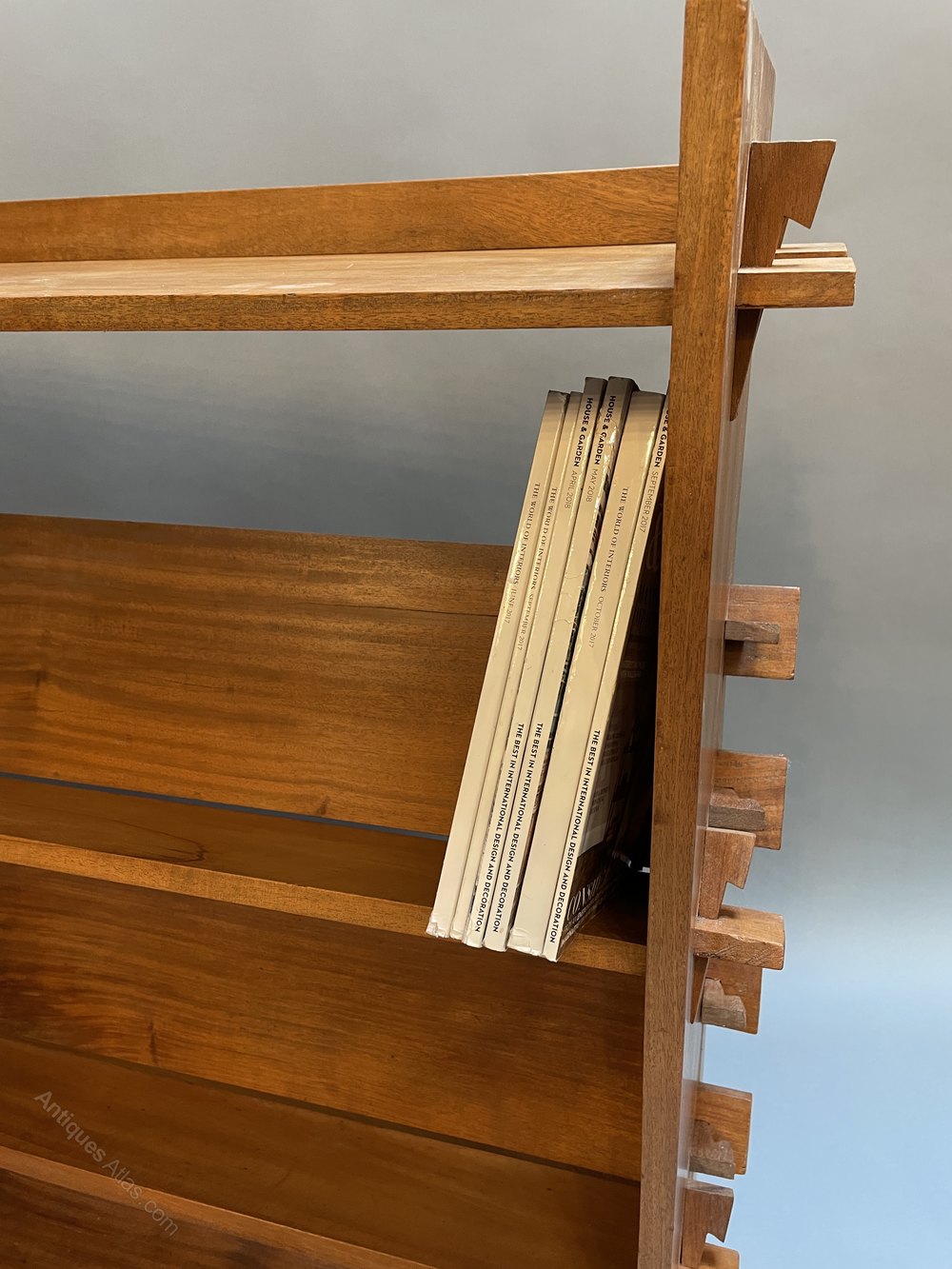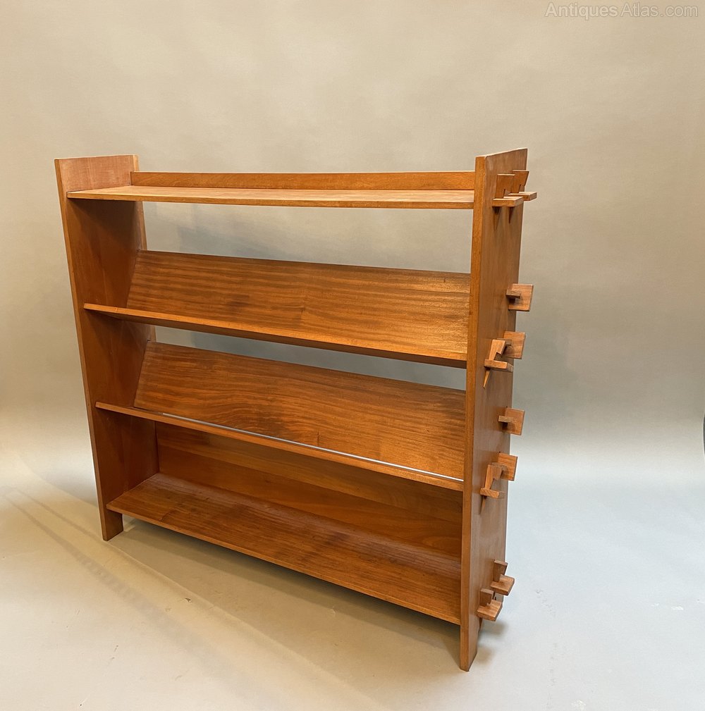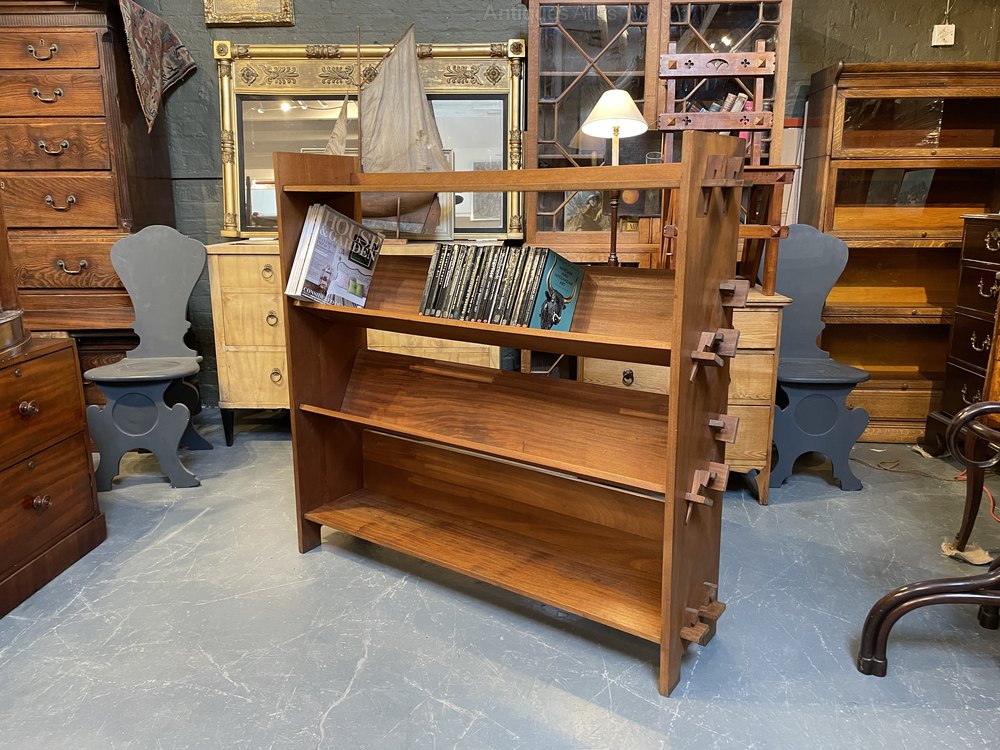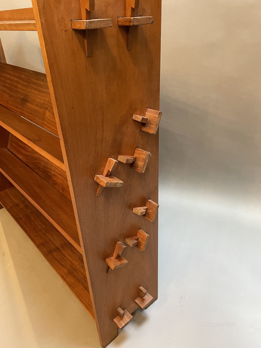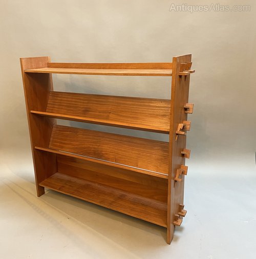 Early C20th Cotswold School figured pale mahogany of pegged construction , the top shelf over 2 angled shelves and a lower shelf.