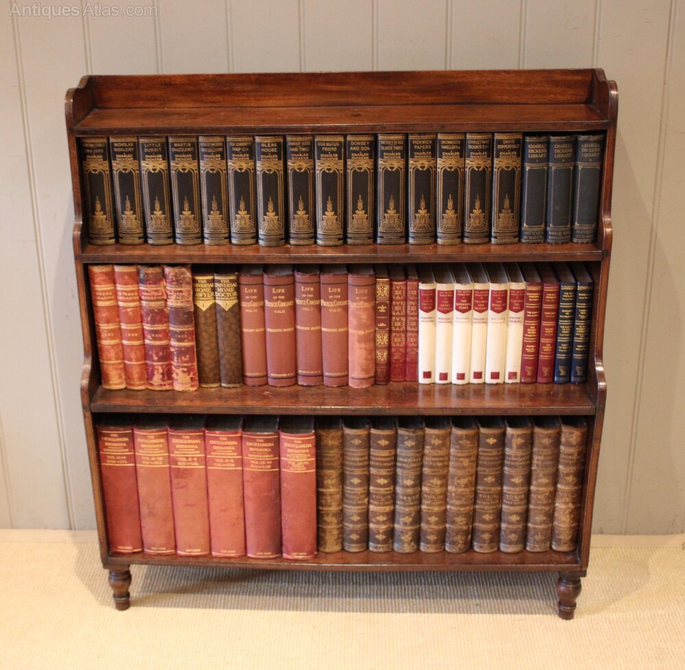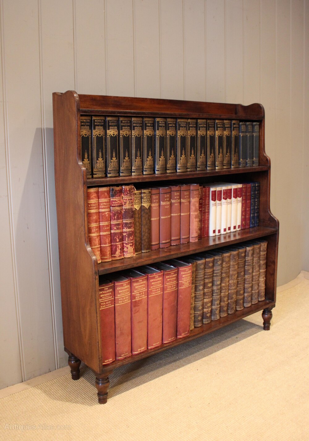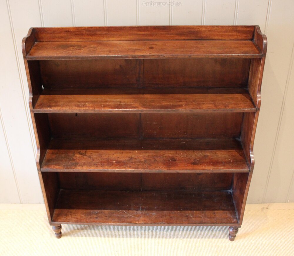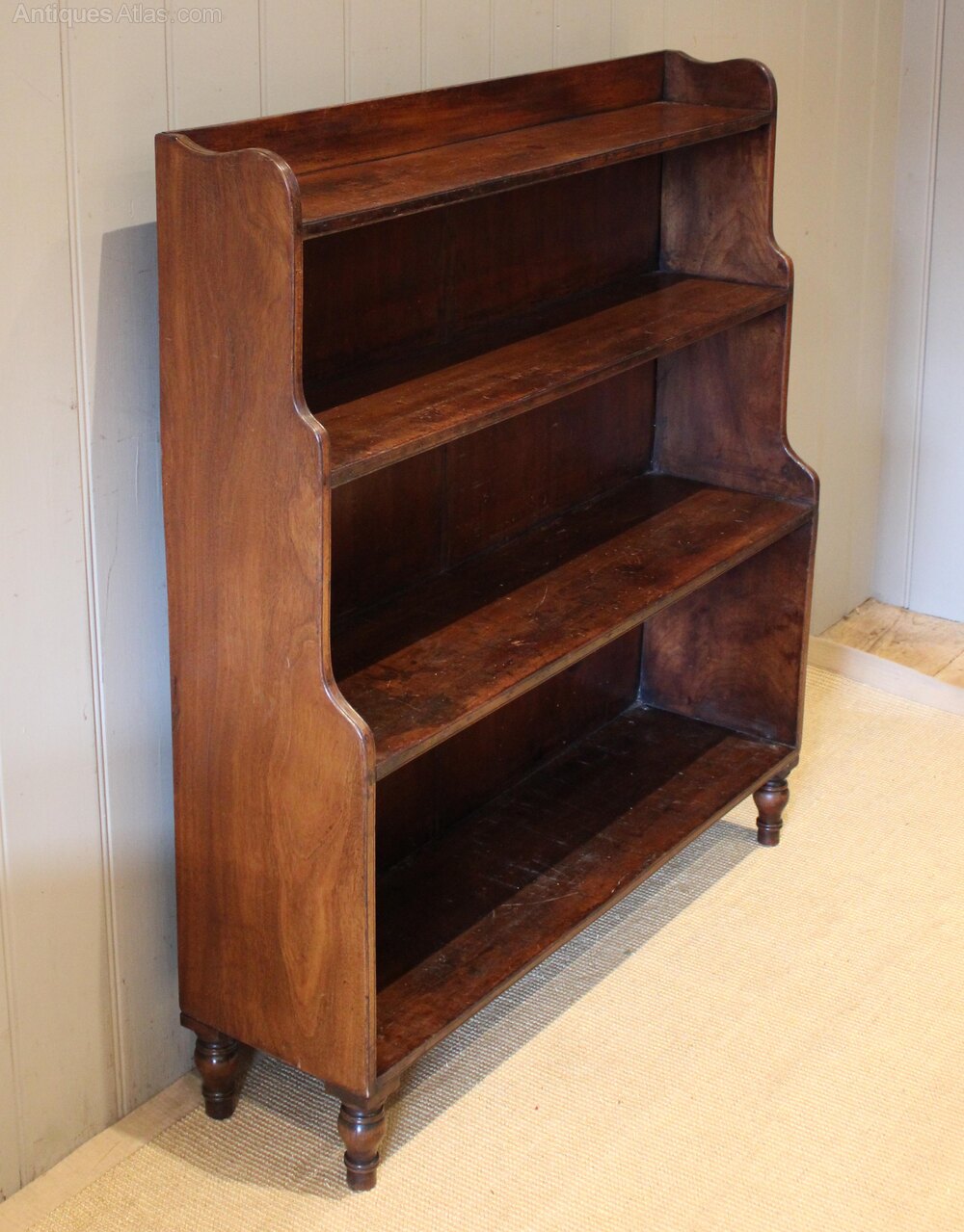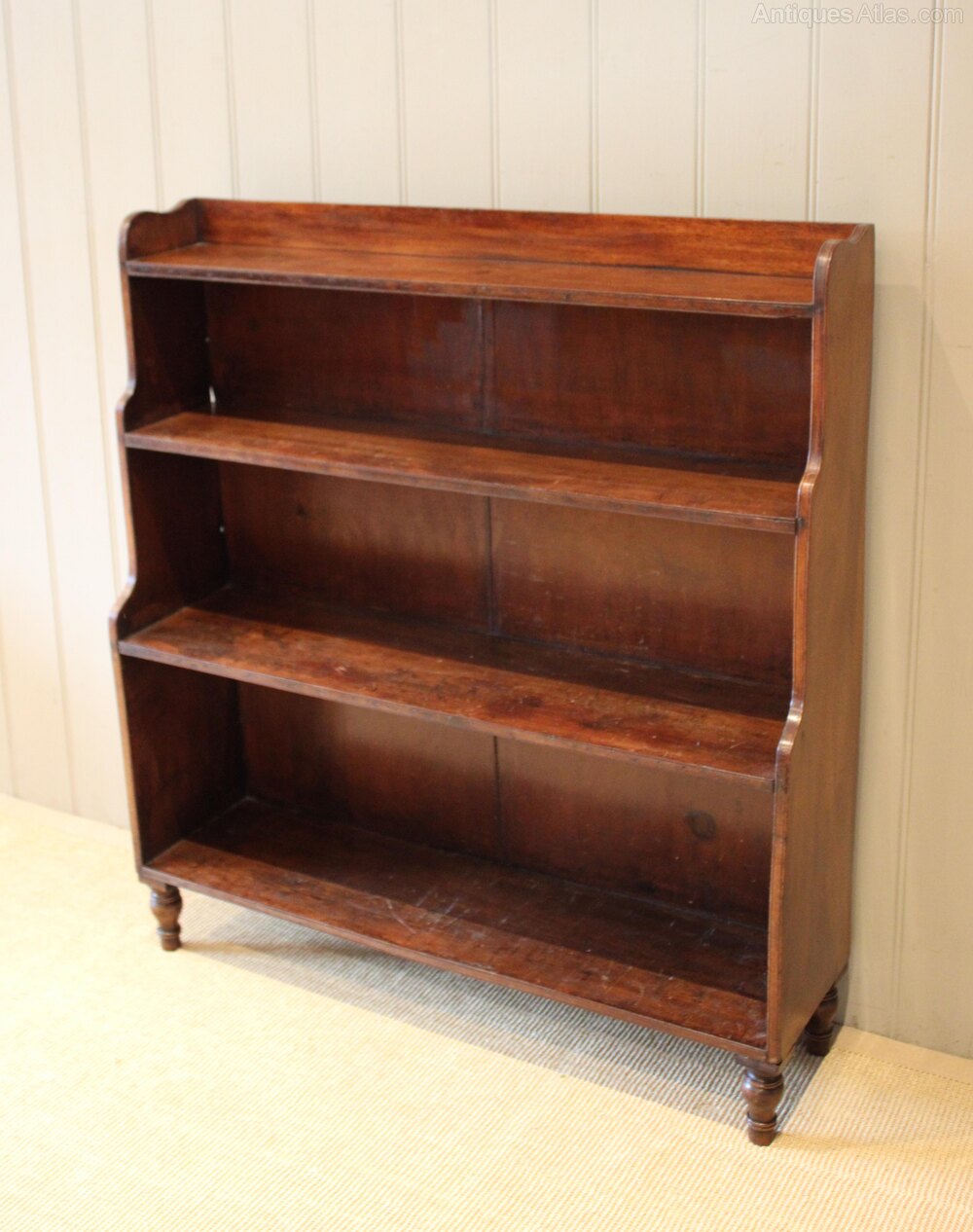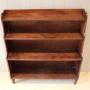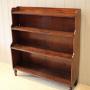 Country oak open waterfall bookcase having three graduated shelves , raised on short turned legs . The shelf dimensions are 92 cm wide and from the bottom up 24 cm deep by 32 cm high , 24 cm high by 25.5 cm high and at the top 18.5 cm deep by 20 cm high .