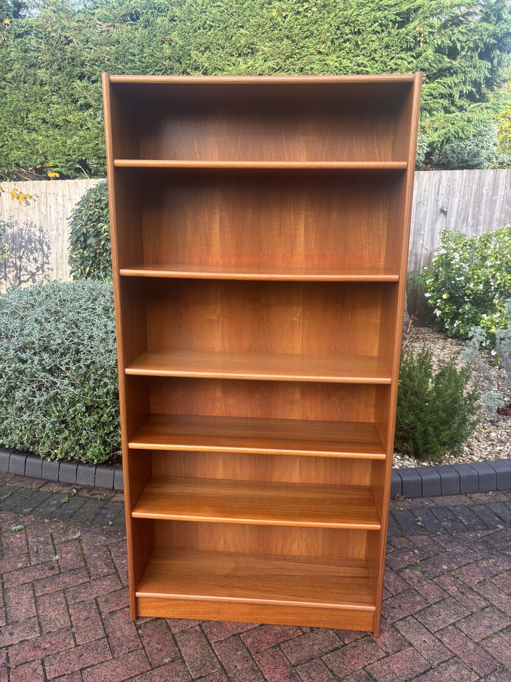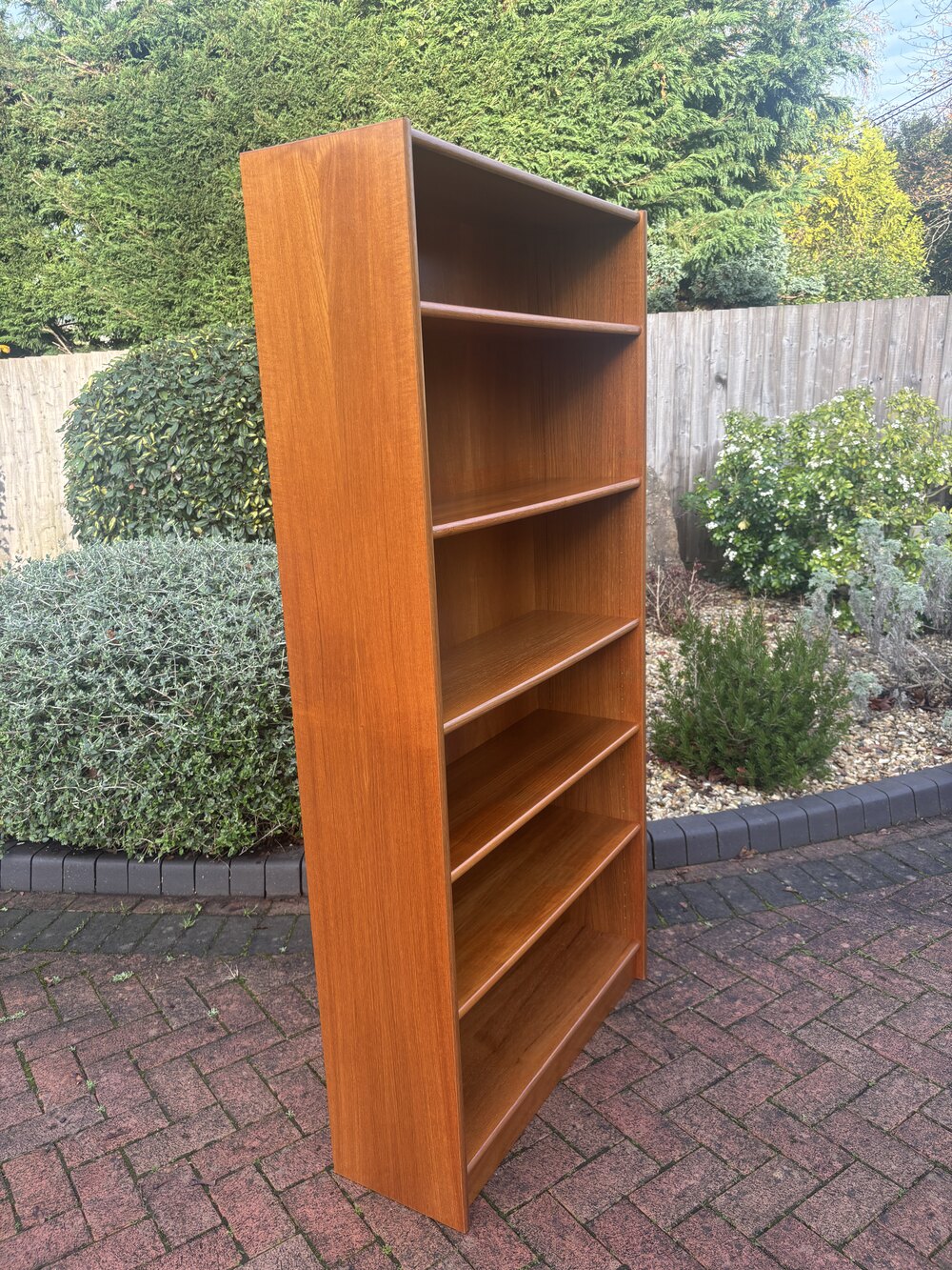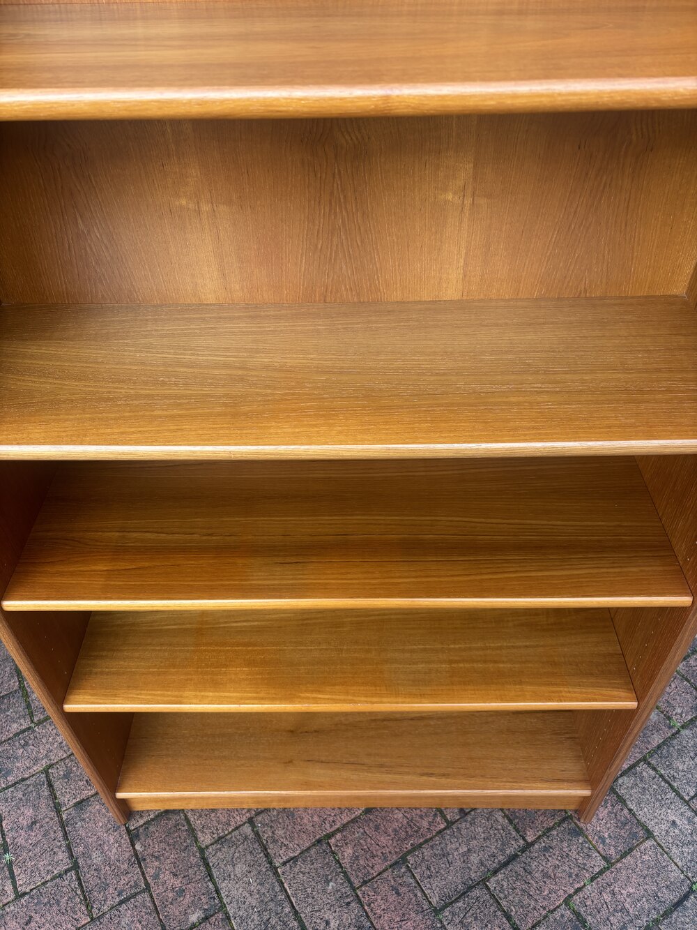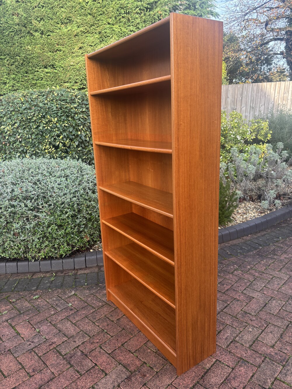 Danish mid century tall teak bookcase c1960's, having 1 fixed shelf and 4 adjustable shelves with metal shelf brackets. Although unmarked these metal shelf brackets are only on Danish bookcases.