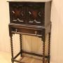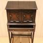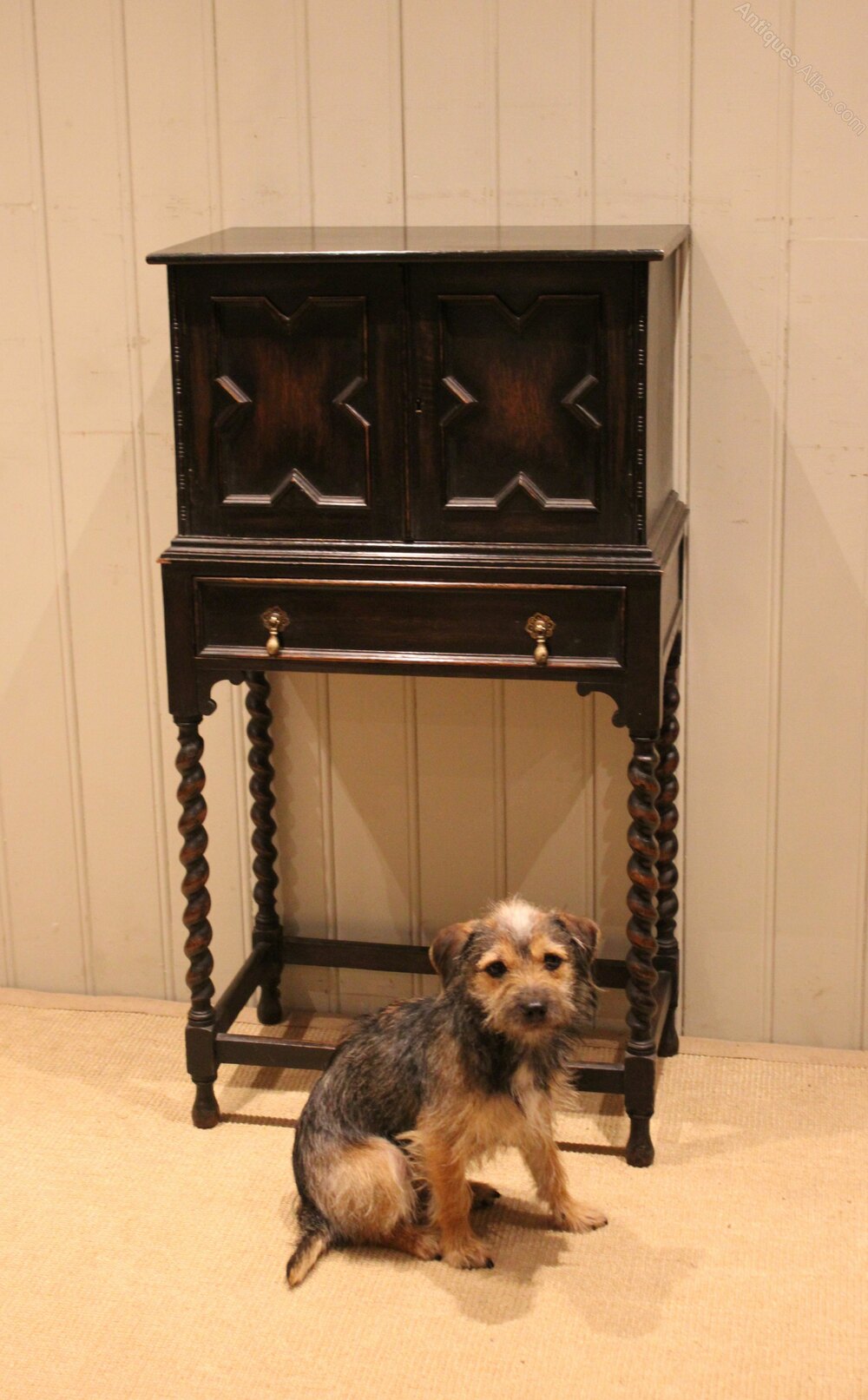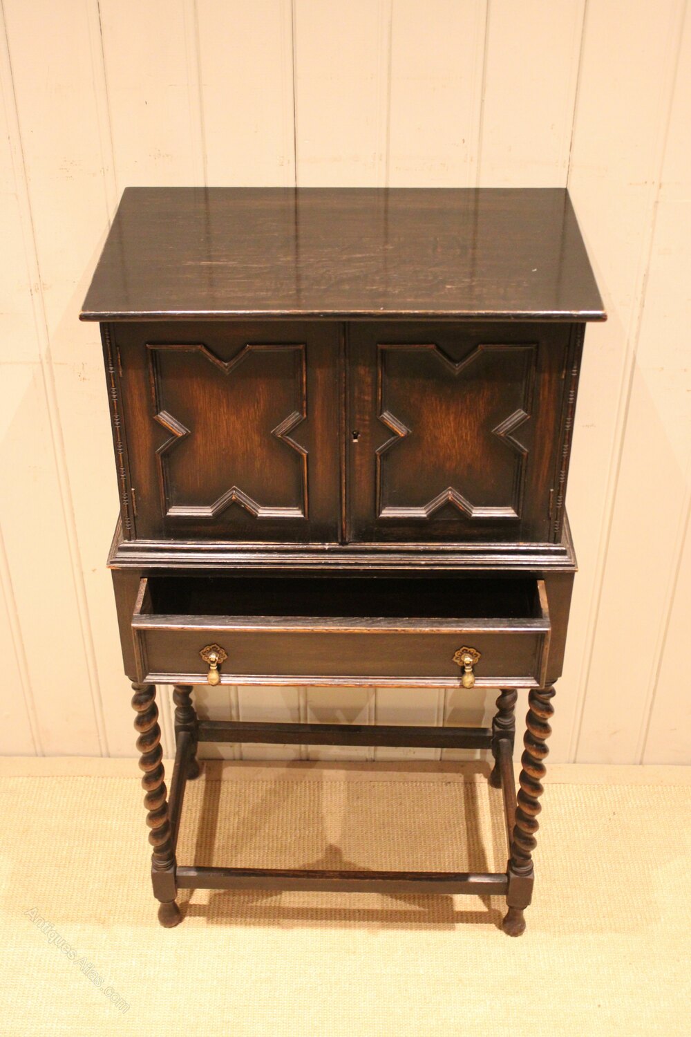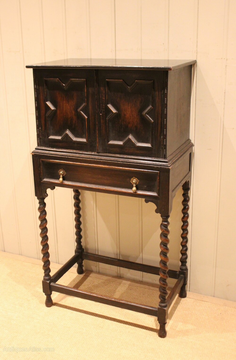 Dark oak side cabinet having a two door cabinet above a single drawer raised on barley twist supports united by a stretcher.