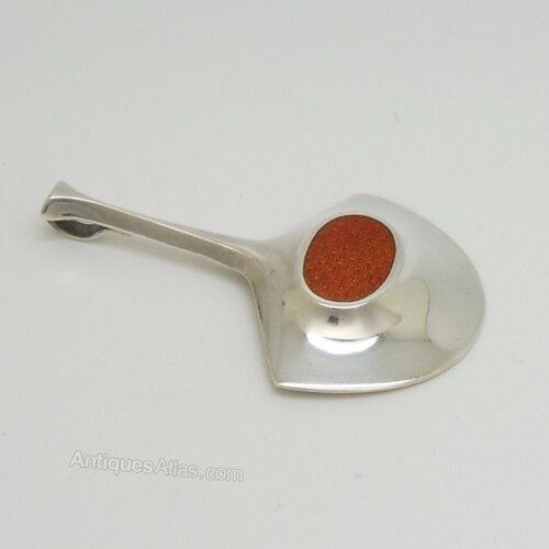 Fashioned from silver and shaped like Thor's hammer this wonderful piece is inlaid with a vivid orange enamel that has an almost metallic sheen.