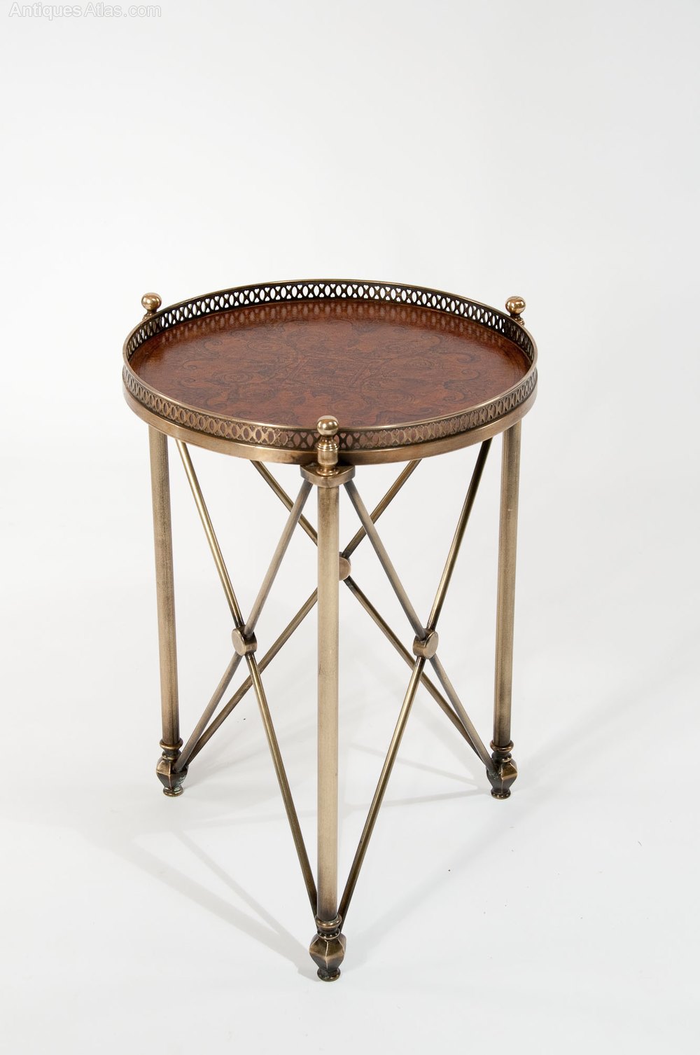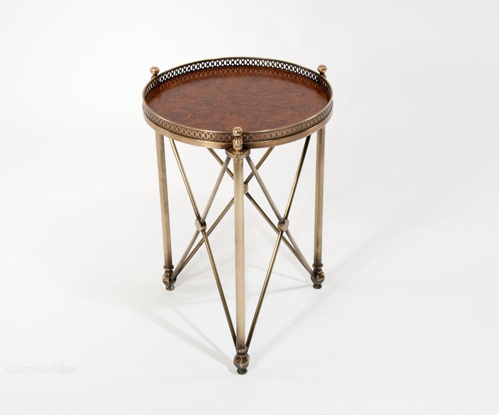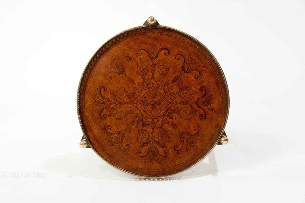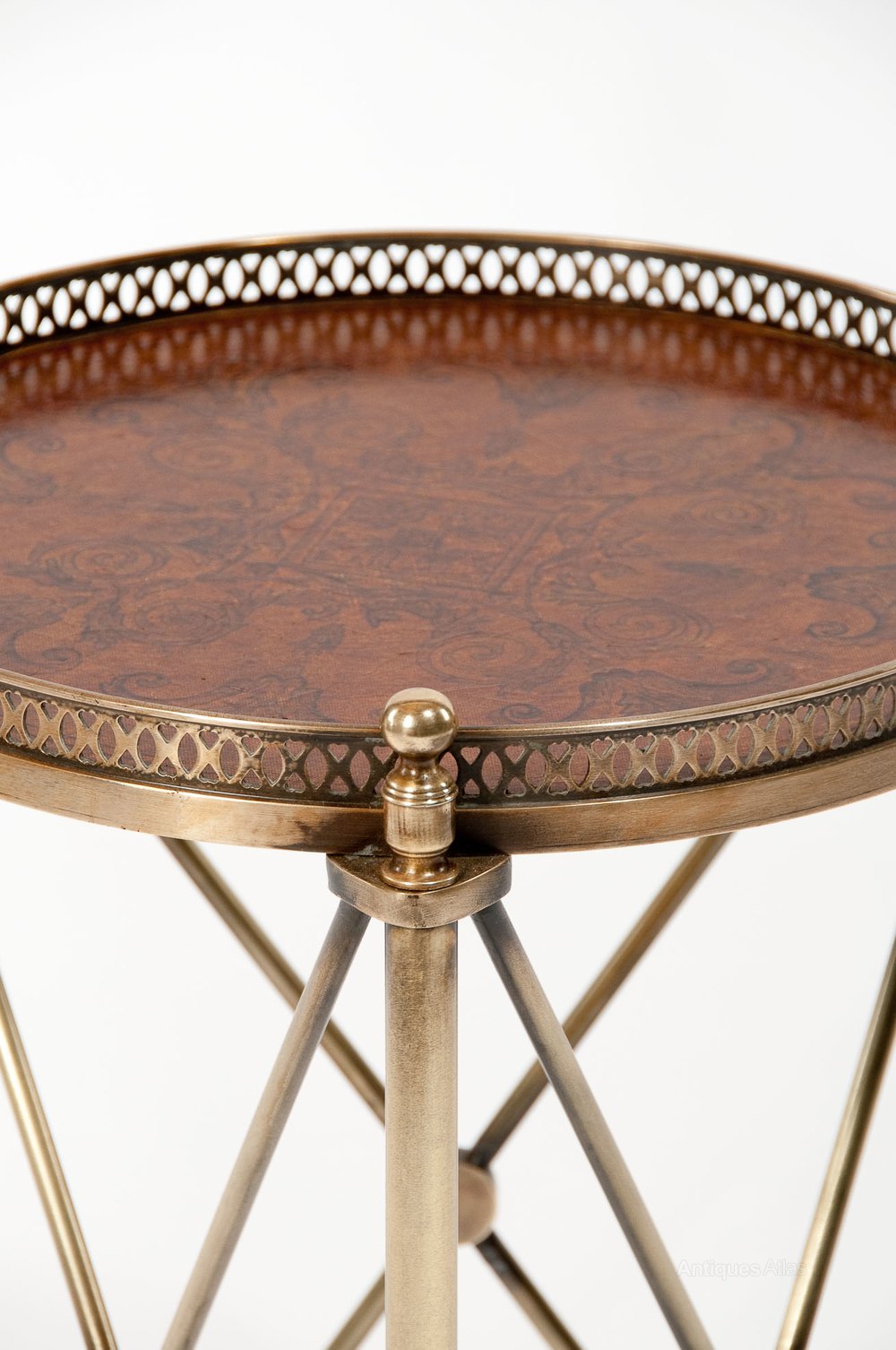 A decorative brass and embossed leather table of Regency design. A well made mid 20th century brass occasional table with an embossed circular tan leather top enclosed by a fretted gallery raised by three brass turnings united by X frame stretchers. A very attractive and well designed occasional table that will work in most rooms of the house.