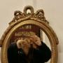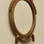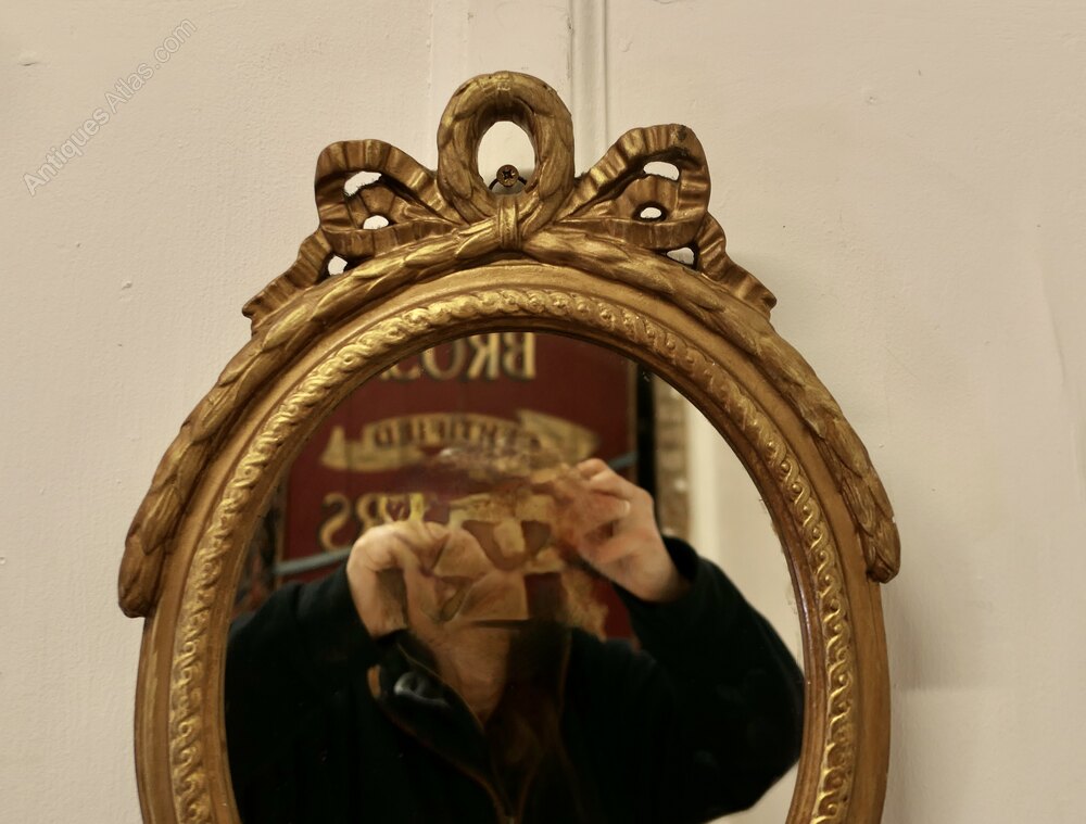 This Mirror has a 1.5” wide moulded oval frame, it has a decorative ribbon swag at the top and this a good dark gilt finish