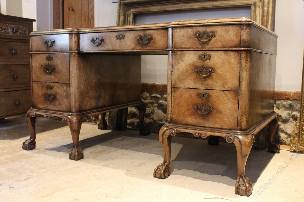 Here we have a wonderful Queen Anne inspired Edwardian Walnut desk c1910. As you can see the desk has a stunning mellowed colour and patina. The colour has perfect interior design appeal and the desk sits well and commands your attention. There is a well shaped break front top both front and rear. There is a tooled and gilded leather skiver and a shallow frieze and stepped moulded edge. There are three drawers to the top and three drawers to each pedestal. The top separates for ease of moving. All the drawers retain their original beautiful brass handles and have solid Oak linings and hand cut dovetail joints. The pedestals have a bracket base with the most stunning solid walnut carved cabriole legs and claw and ball feet. A super quality desk in great retail condition ready for your home. The dimensions are approx 139 cm wide 77 cm deep 77 cm high.