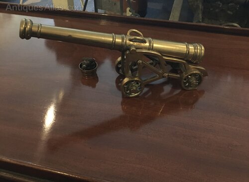 This is a really well made brass desk top cannon. Really well cast it comes with a cast brass bucket and iron cannon balls. There are no casting seams on the cannon the wheels turn the barrel lifts of the trolley probably 1920 just because of the quality of the whole thing. The barrel is not drilled through so it can’t be fired. Heavy solid