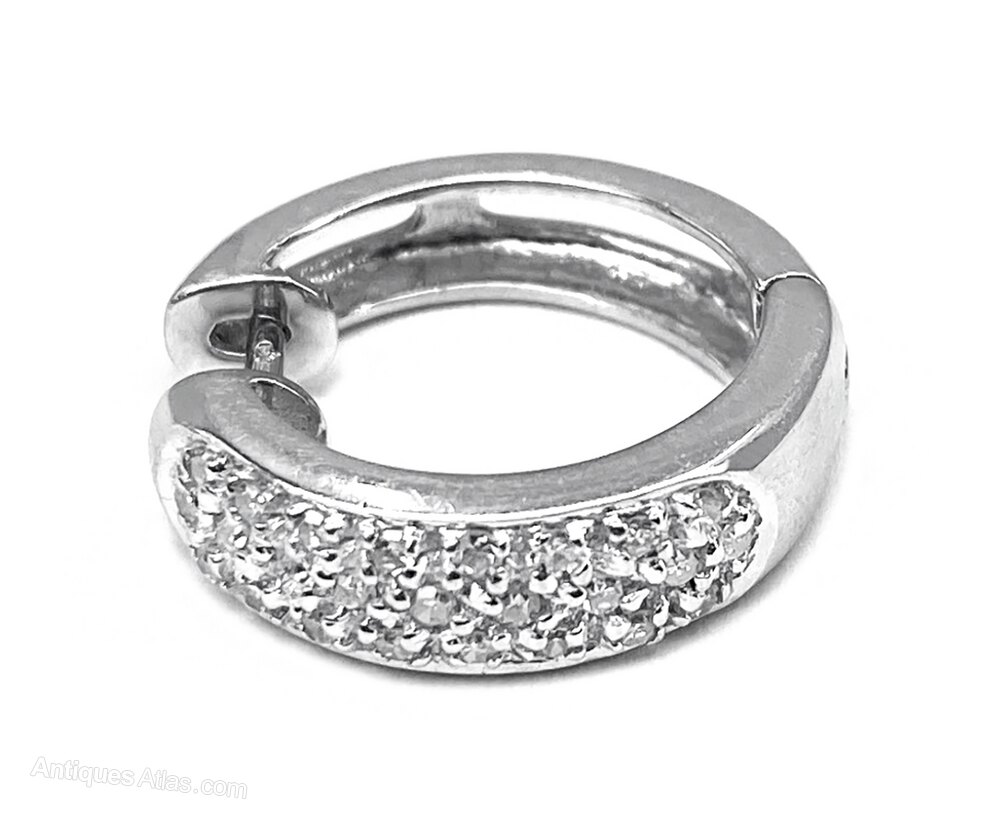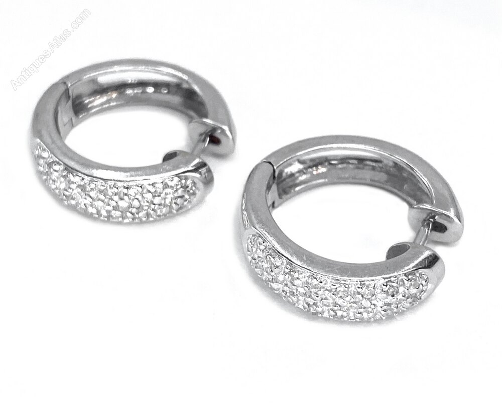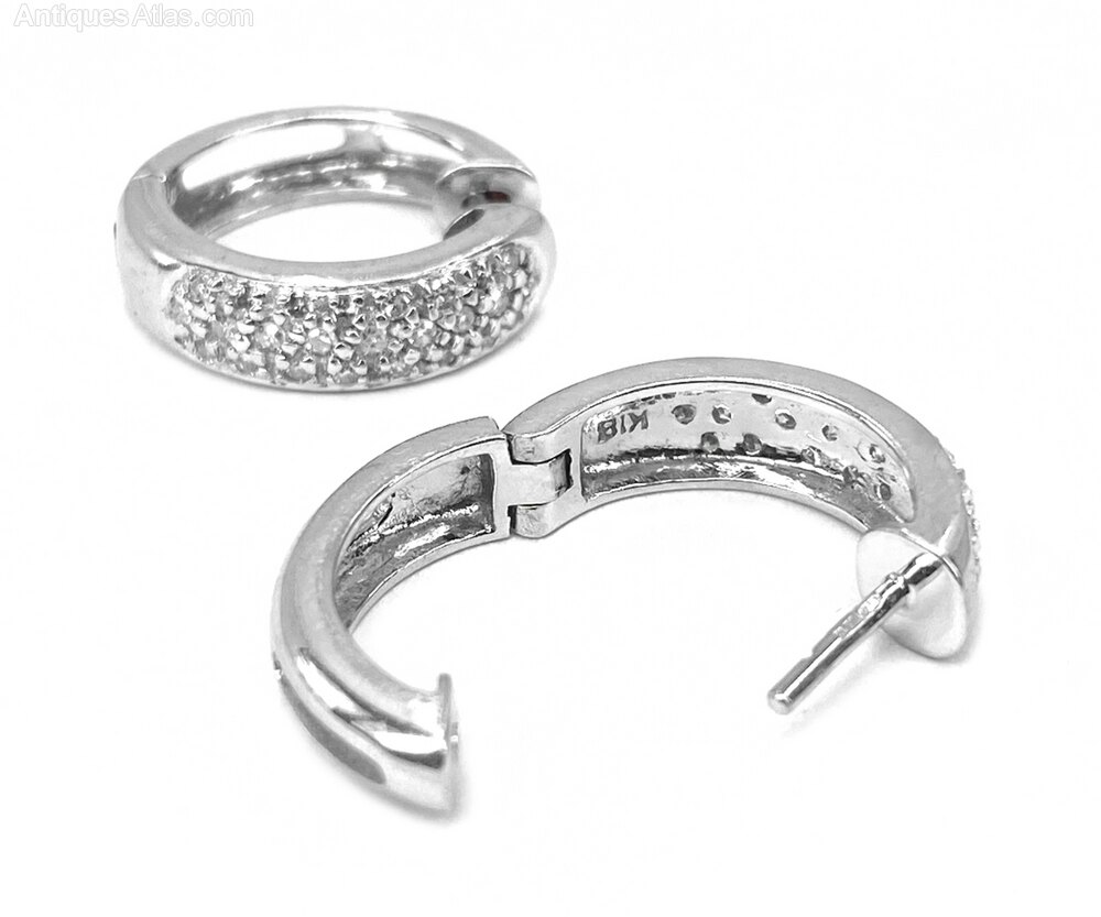 Hoop earrings are always elegant and can be worn day or evening. These have 50 diamonds approximately 0.01 carat each = 0.50 carat total pave set in 18 carat white gold. They measure 16.59 mm and weigh 5.65 grams.
