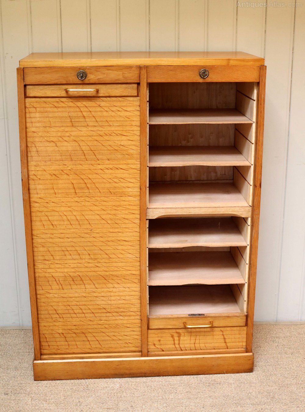 Double tambour front filing cabinet having six shaped fully adjustable plywood shelves to either side with a brass handle and working lock and key to each side
