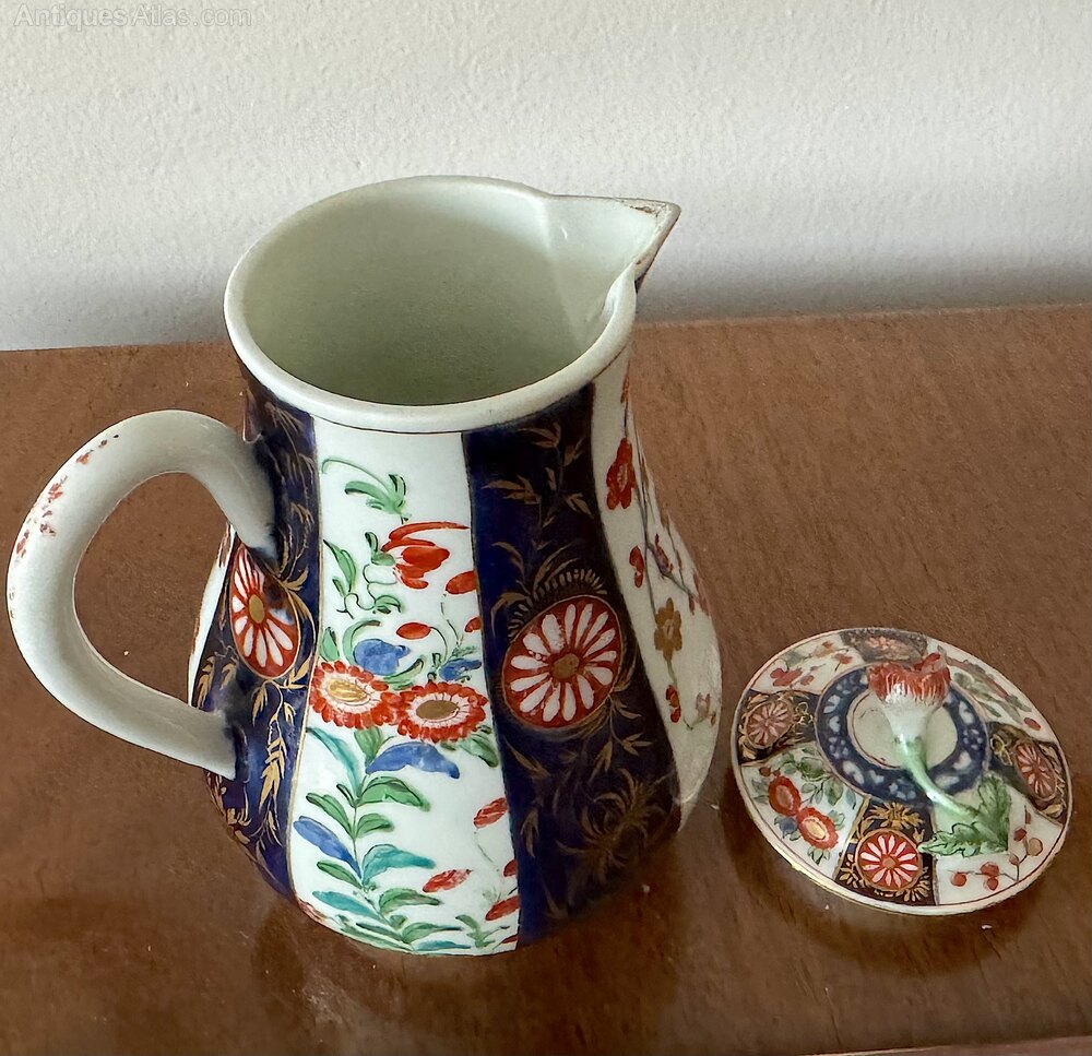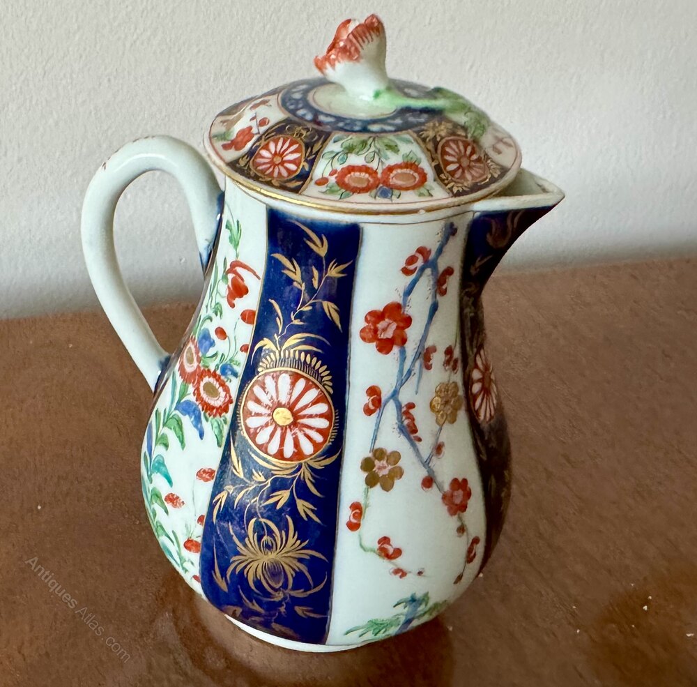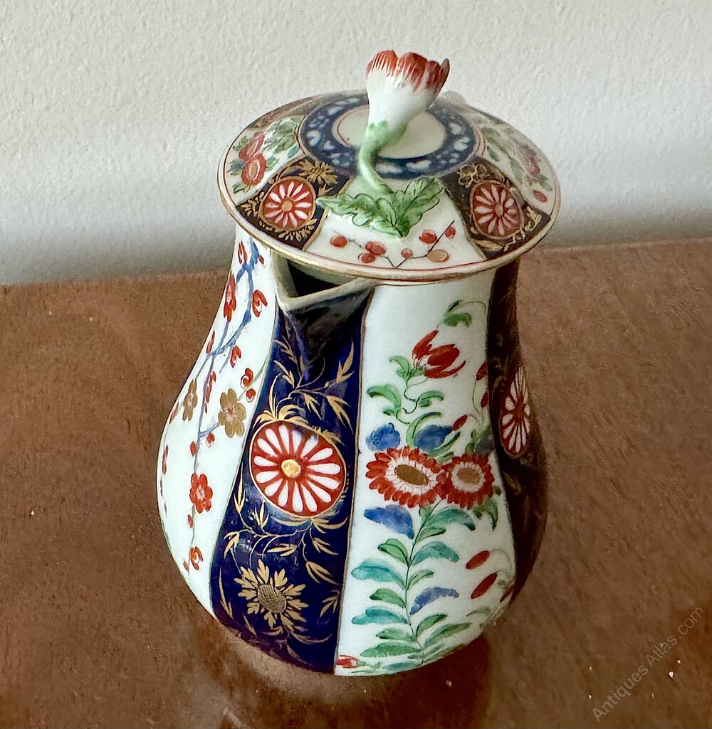 This lovely sparrow beak lidded jug is decorated in the Queens pattern consisting of an Imari inspired pattern with vertical gilded panels alternately painted with chrysanthemums against a white ground and foliate gilded cobalt blue panels each containing a reserve decorated with a stylised chrysanthemum flower against a white ground. The lid is likewise decorated but with the addition of molded green leaf extending to a molded red chrysanthemum finial. The base of the dish carries the 1st period Worcester pseudo square blue fret mark.