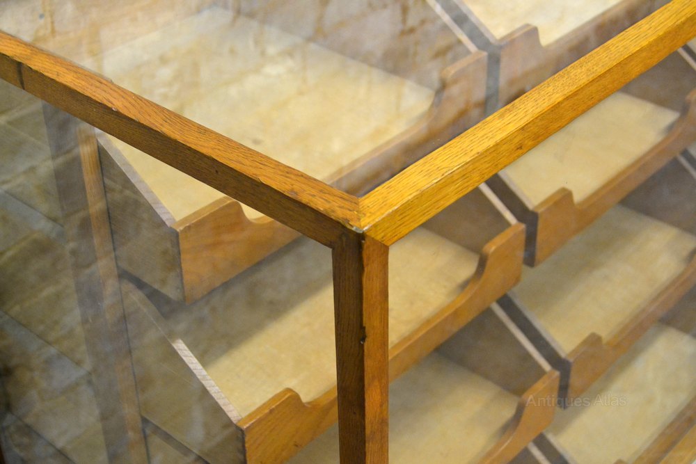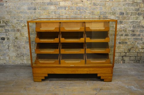 This is a beautiful 1930s haberdashery drapers cabinet with 12 drawers - it's a very hard to find size and would fit into a range of shops. Made by Dudley & Co of Holloway, and has stepped Art Deco feet. It's a fully restored item with new toughened glass. We have similar cabinets available - 180cm in width. We do have versions in restored or original condition.