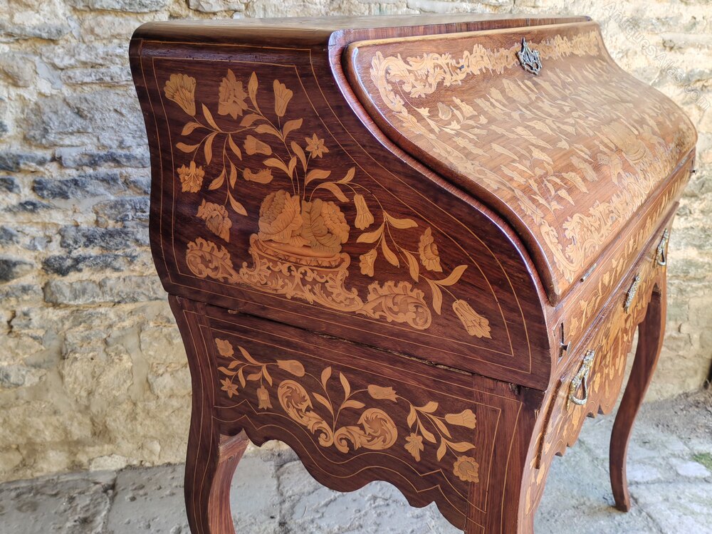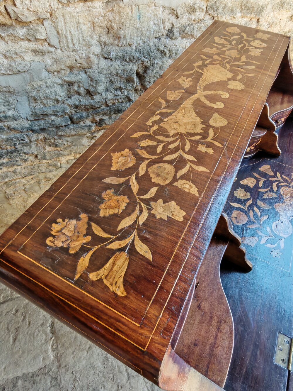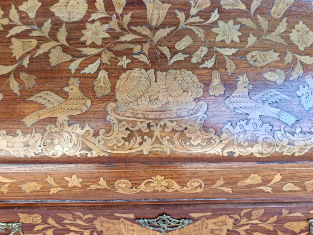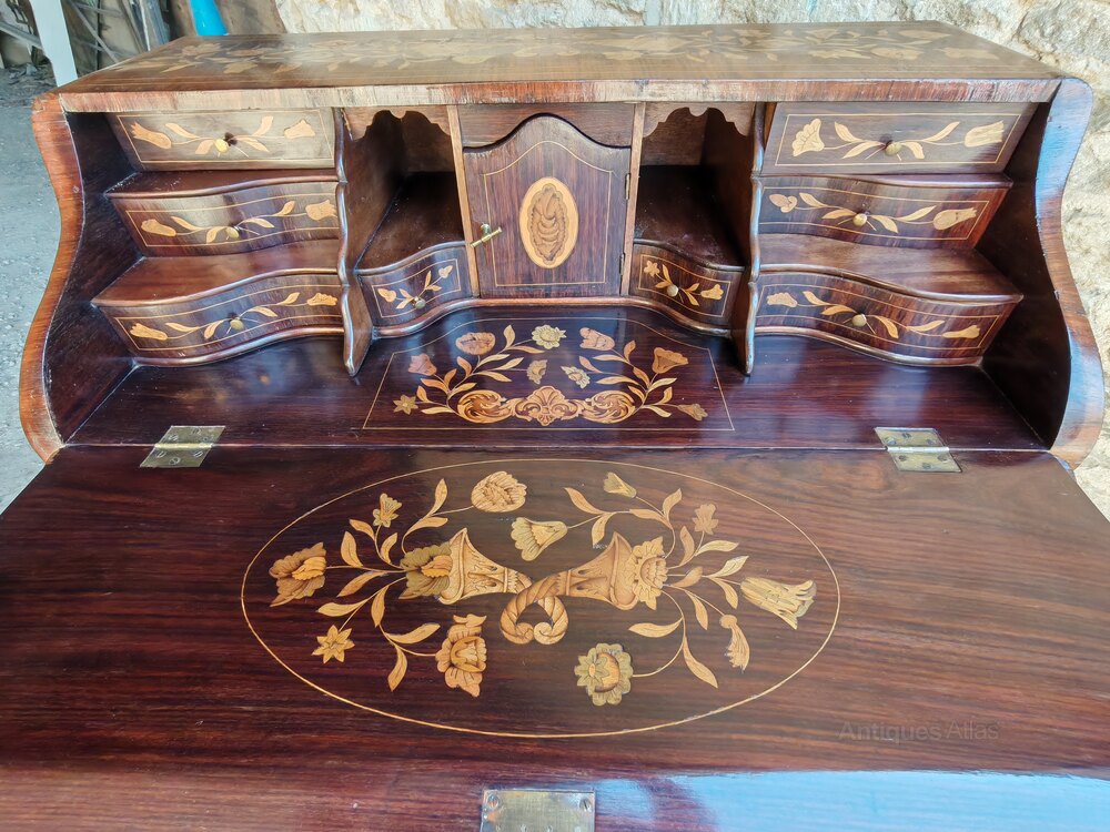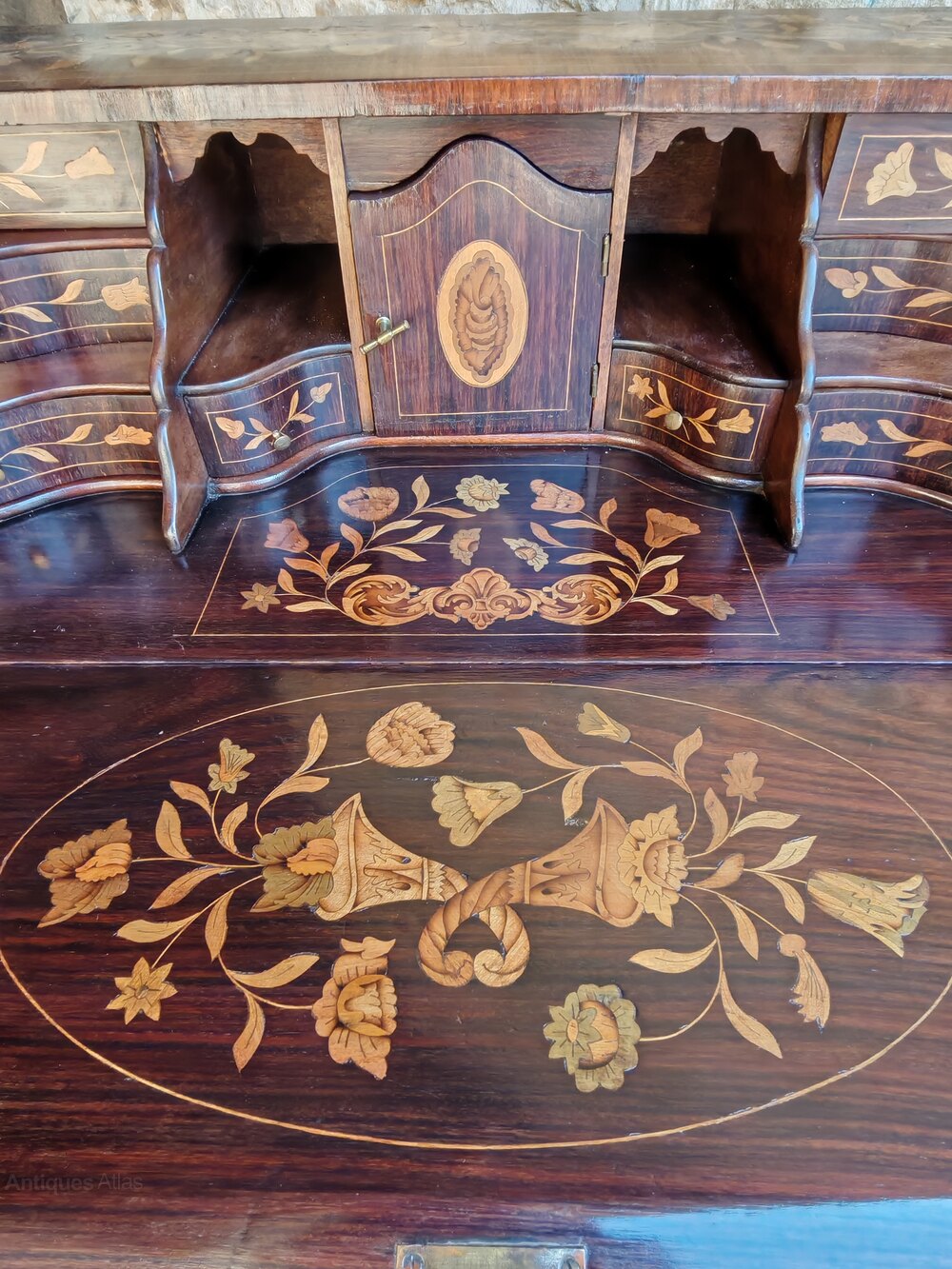 A superb Dutch marquetry bureau circa 1800. With beautiful marquetry decoration throughout. A stunning interior with 8 drawers, 2 pigeons holes and a compartment with a door containing a further drawer. Below the bureau section is a full length drawer for additional storage space and the piece stands on elegant cabriole shaped legs.