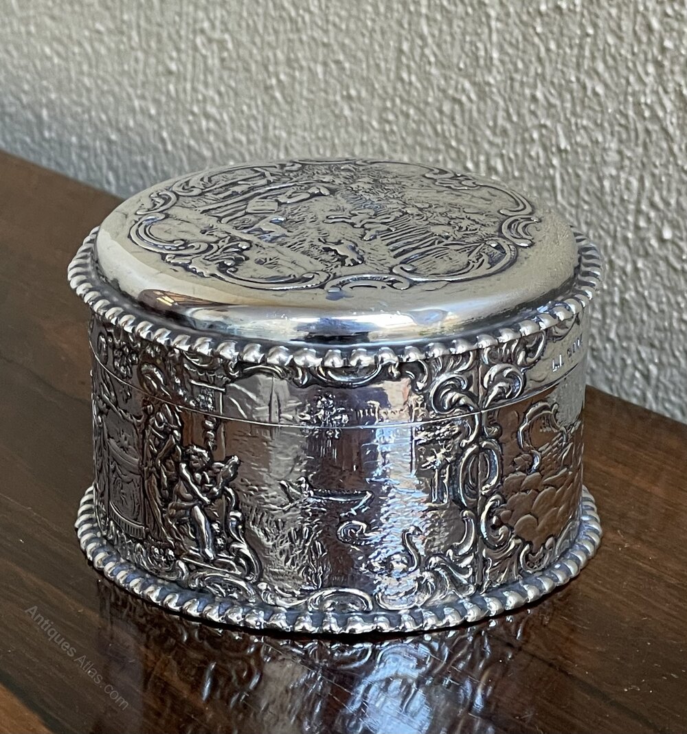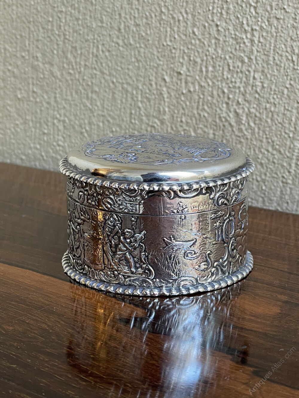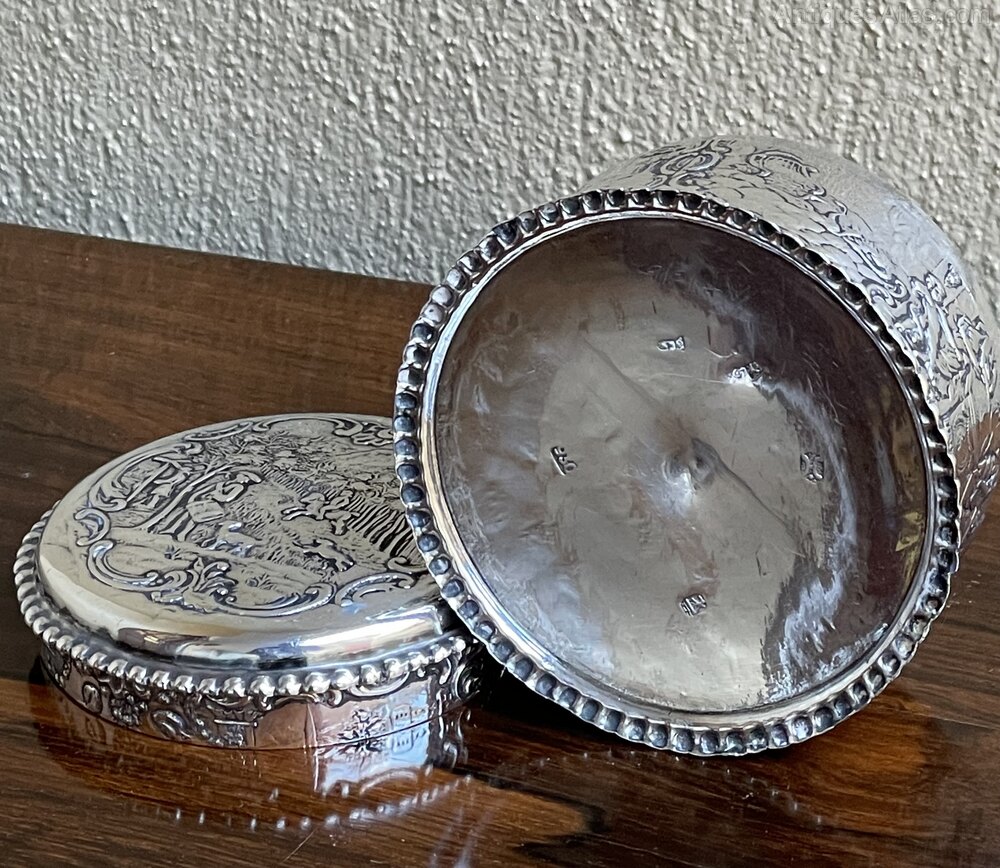 A beautiful ornate late nineteenth century solid silver circular dressing table box with all over repousse decoration of classic scenes. The base bearing the graceful “H” hallmark for Herbert Hooijkaas, a Dutch silversmith who operated in Schoonhoven between 1890 and 1910. The piece also bears English import marks for London, 1896 by Louis Landsberg.