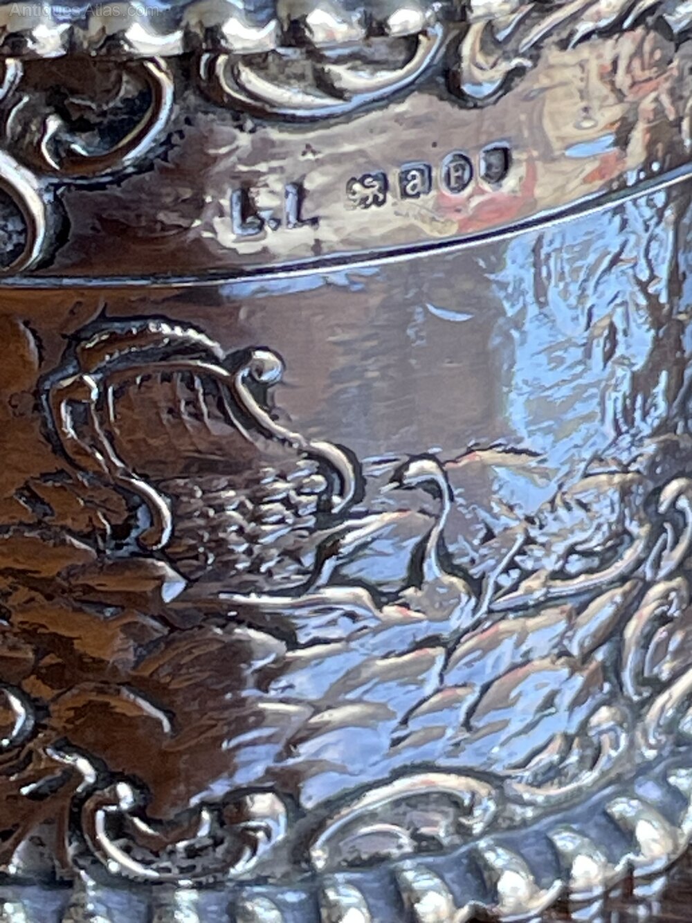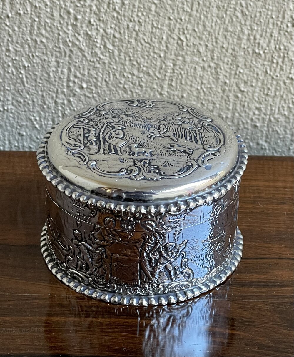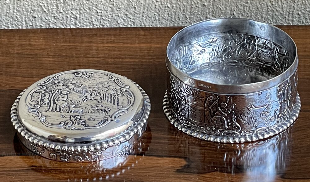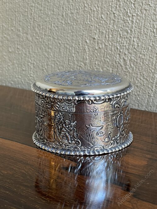 A beautiful ornate late nineteenth century solid silver circular dressing table box with all over repousse decoration of classic scenes. The base bearing the graceful “H” hallmark for Herbert Hooijkaas, a Dutch silversmith who operated in Schoonhoven between 1890 and 1910. The piece also bears English import marks for London, 1896 by Louis Landsberg.