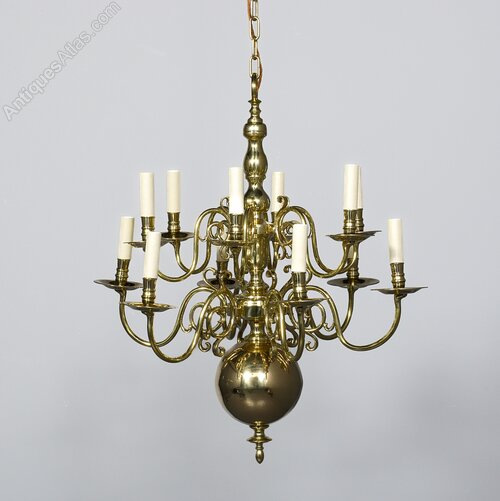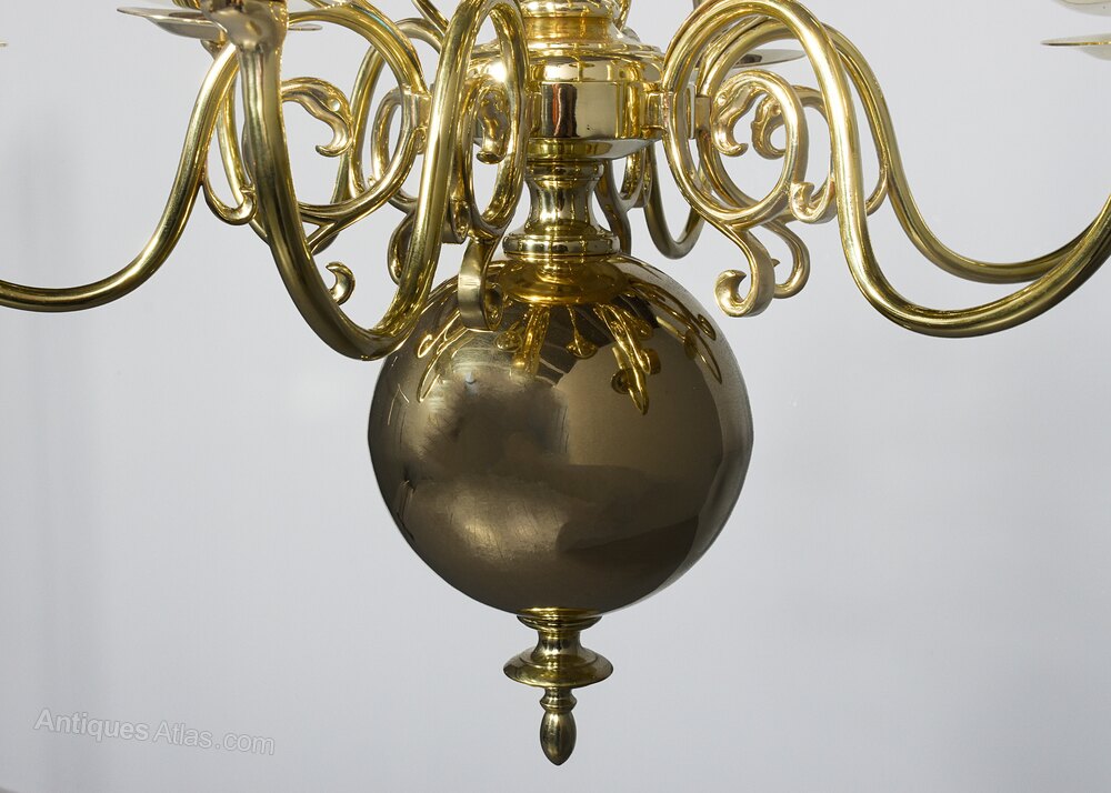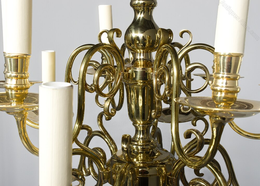 Circa 1900. A large classic Dutch brass two tier chandelier, surmounted with a cast brass circular loop on a centrally turned stem, which issues six curvaceous arms finishing with large circular brass drip trays and stylish nozzles, beneath there is a small urn, and another row of six similar arms, each of the 12 lamp holders are finished with a faux candle, the bottom with a large bulbous sphere with a downward facing finial, the chandelier has recently been cleaned and rewired, the generous size chandelier comes with one meter of brass chain and bulbs.