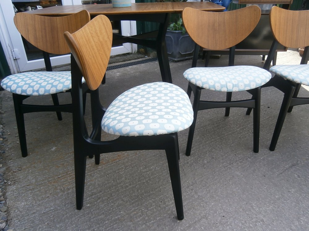 The seat pads have been recovered in a complementary fabric in a pale turquiose mid century type design. The original EG labels have been rescued from the original chair fabric and attached to the underside of the seats.