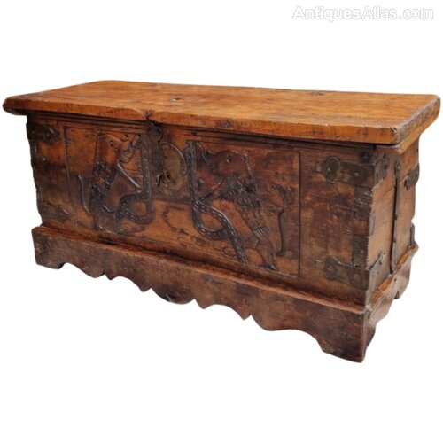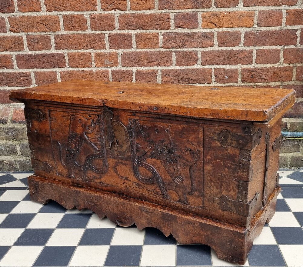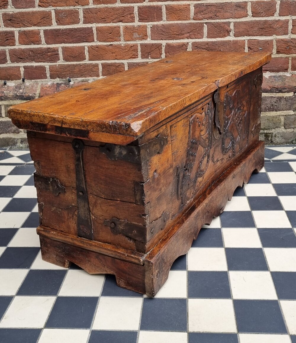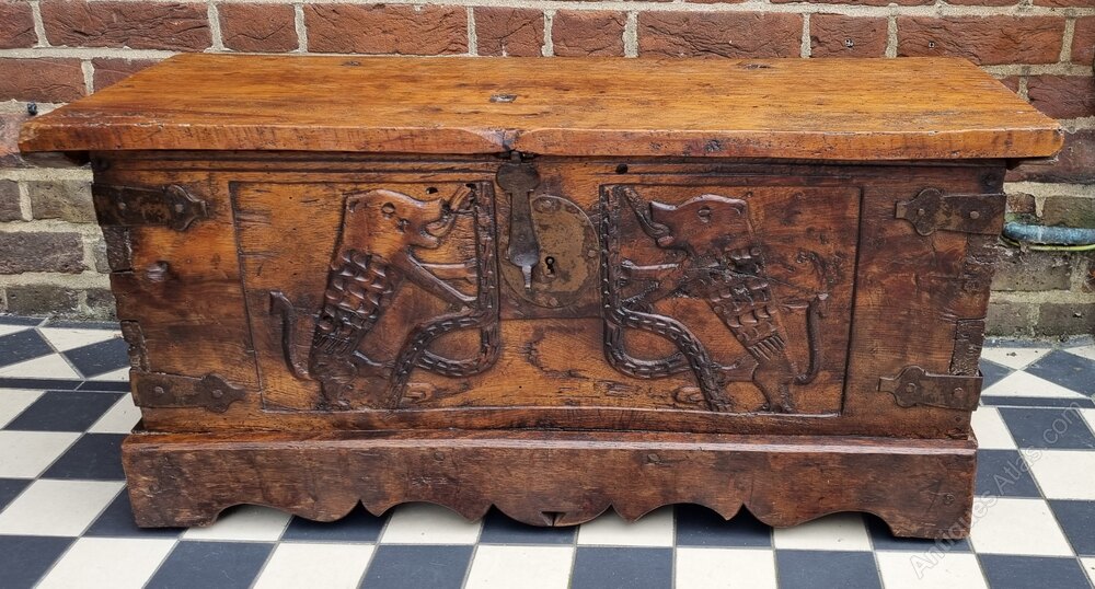 An early 16th-century Flemish walnut coffer from the Renaissance period showcases a rich color and a well-preserved, original, untouched patina. The exterior is reinforced with its original decorative iron strapwork, secured with handmade nails. The front is hand-carved, depicting two mythical beasts facing each other with ropes in their mouths, holding the top down, which adds a unique aesthetic appeal. The lid, attached with original iron pin hinges on each side, lifts to reveal the untouched interior. The coffer is raised on its shaped base. It features an iron lock plate with a hasp. This rare item, having survived five centuries with minimal repairs, retains its original patina and character.