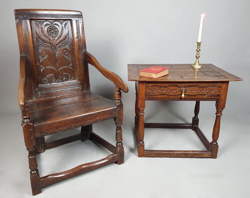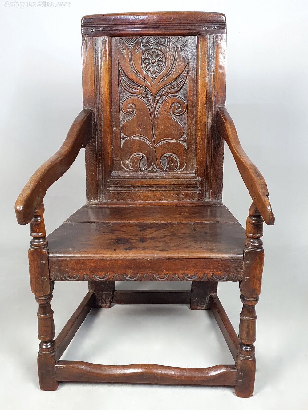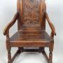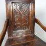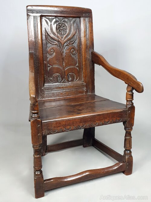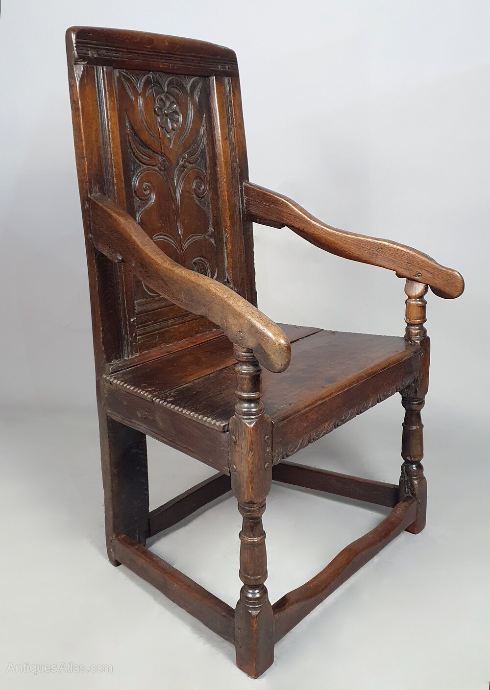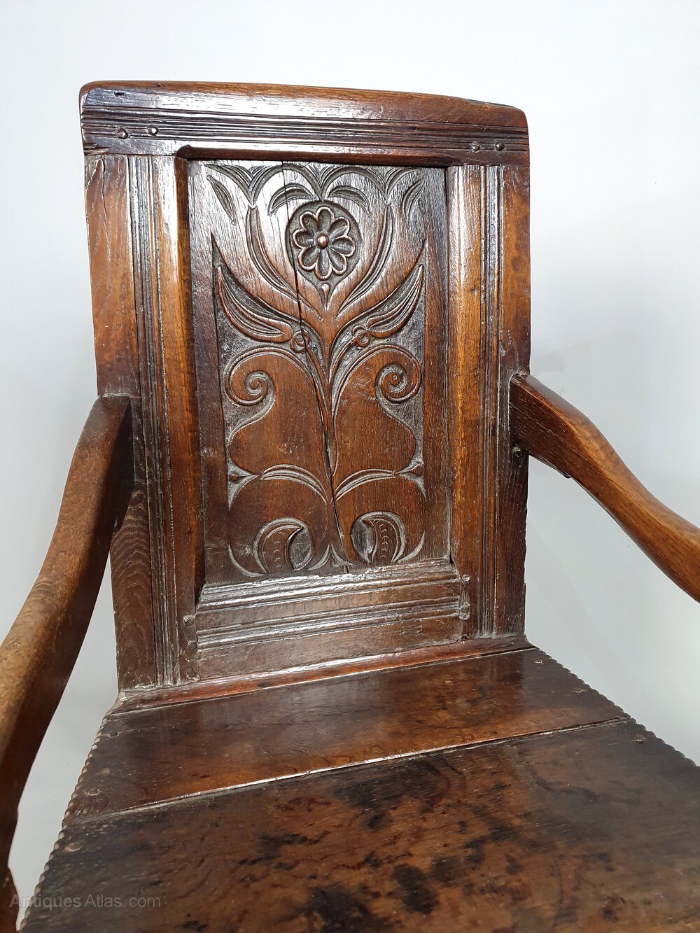 Beautifully grained elm and the colour of the oak combined with the simple shaping and carved panel indicates a provincial chair probably made in Wales in around 1630.