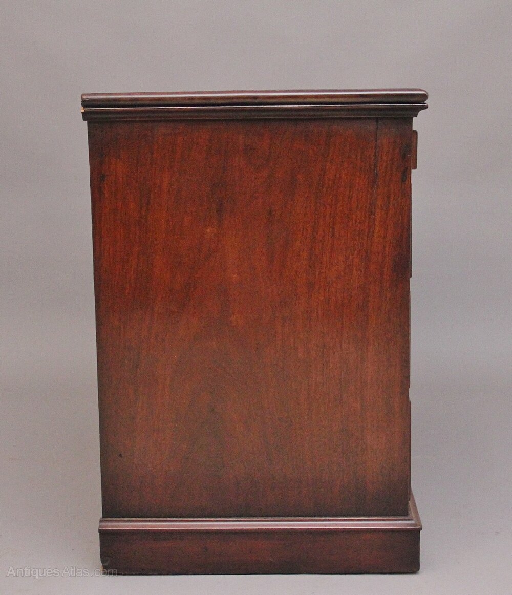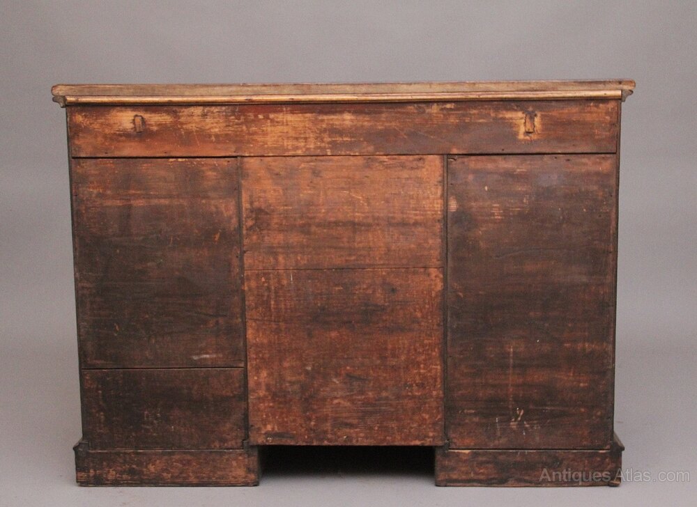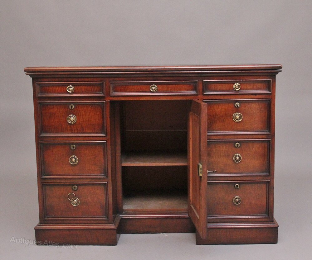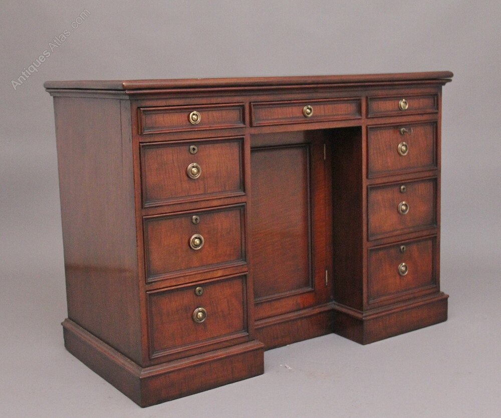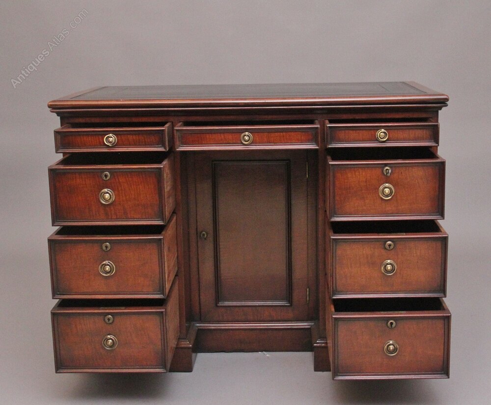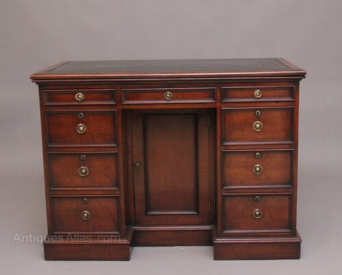 Early 19th Century mahogany kneehole desk, the rectangular moulded edge top having a black leather writing surface decorated with blind and gold tooling, a selection of nine graduated mahogany lined drawers with original brass ring handles, hinged cupboard door at the centre within the kneehole with a single shelf inside, supported on a moulded edge plinth base. Lovely colour and in great condition. Circa 1830.