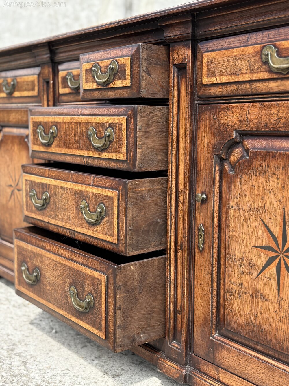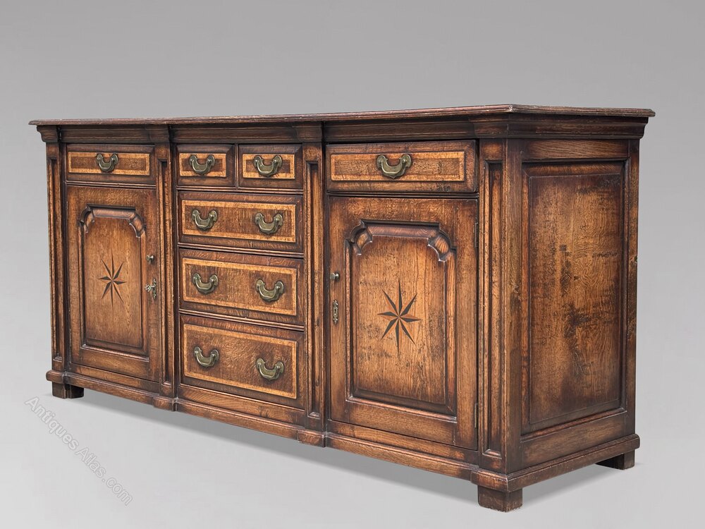 Burr elm crossbanded top with moulded edge above 2 long and 2 short burr elm cross banded drawers. The central section with 3 graduated burr elm crossbanded drawers flanked by panelled cupboard doors with marquetry inlaid star. Original brass handles. Excellent colour and patination.