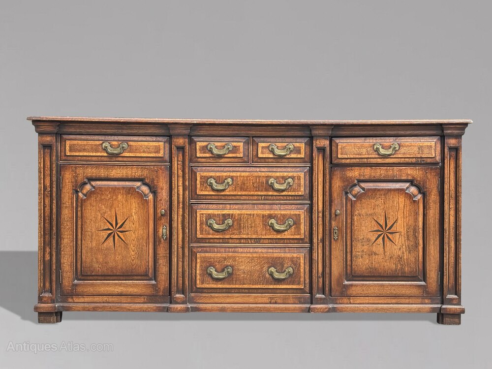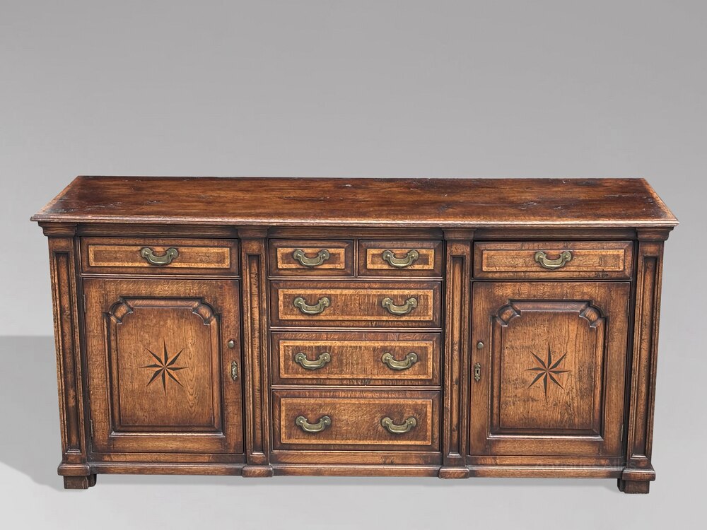This stunning early 19th-century dresser base, crafted from late Georgian oak and adorned with intricate burr elm inlay, is a remarkable piece that beautifully combines historical craftsmanship with aesthetic elegance. Its design reflects the sophistication and functionality of the period, making it a valuable addition to any collection or home setting.