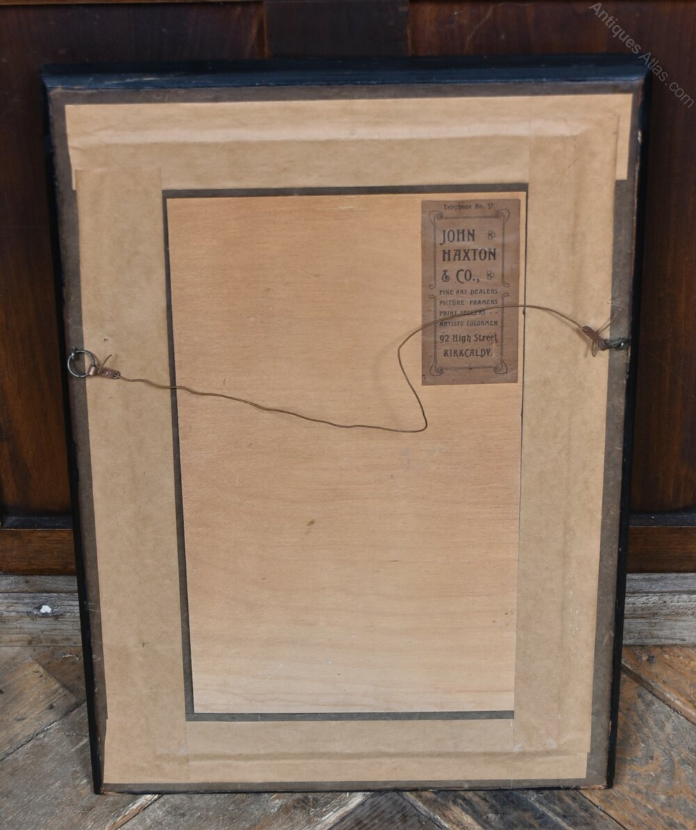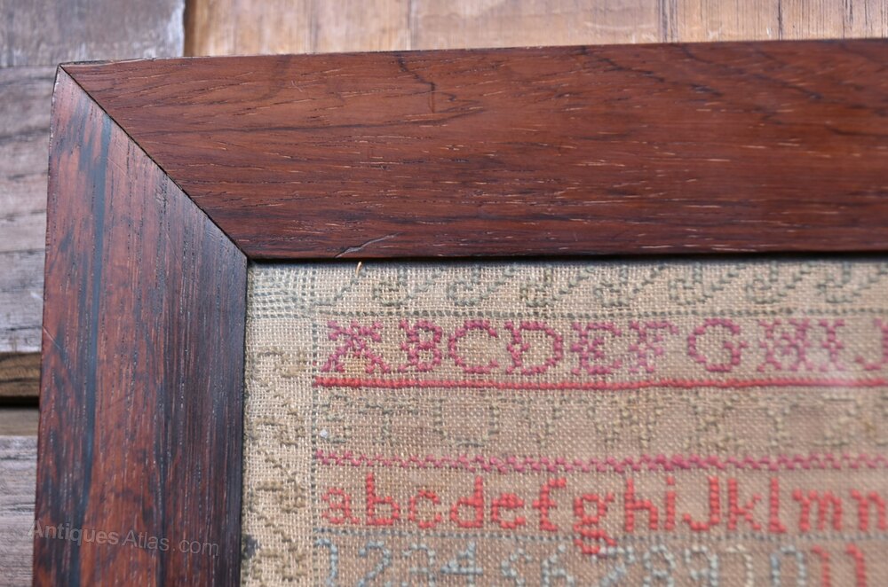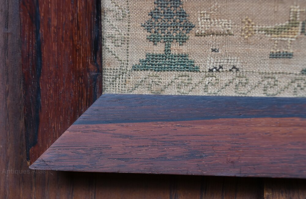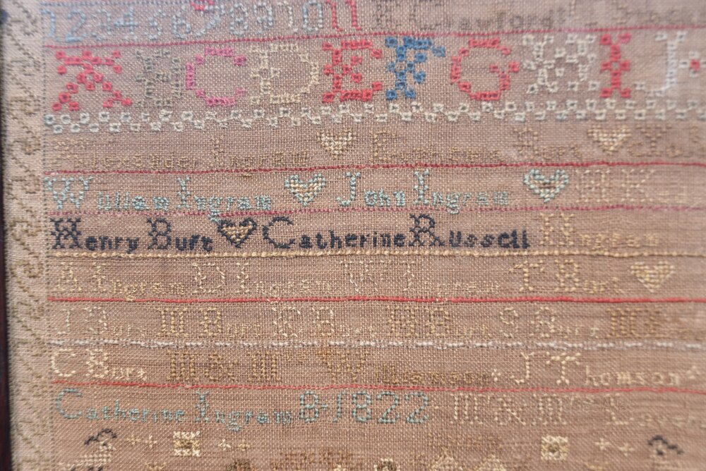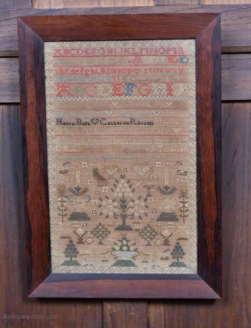 A charming early 19th‑century needlework sampler, beautifully worked in coloured silks in excellent antique condition. The piece includes multiple rows of stitched letters and numbers, followed by a series of names — Wm Ingram, John Ingram, Henry Burt, Catherine Russell, Catherine Ingram 1822, along with several sets of initials. The lower section is richly decorated with traditional motifs including stylised trees, birds, hearts, flowers and geometric devices, all arranged with pleasing symmetry. The sampler is presented in an early frame with a paper backing label for John Haxton & Co., Fine Art Dealers and Picture Framers, 92 High Street, Kirkcaldy, adding a lovely touch of local provenance. A characterful and personal piece of Scottish needlework, full of charm and social history, and a wonderful example of the domestic artistry of the period.