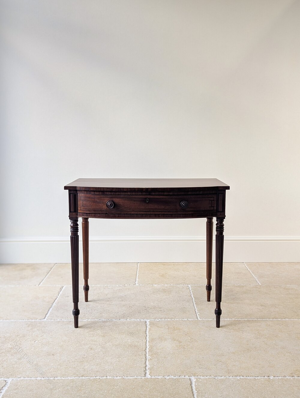 A refined mahogany bow-front writing table of pleasing scale, raised on slender reeded legs with ring-turned ankles. The bowed frieze is fitted with a single drawer, framed with fine linear inlay with turned wooden knobs and flanked by reeded pilasters.