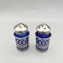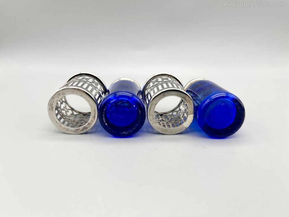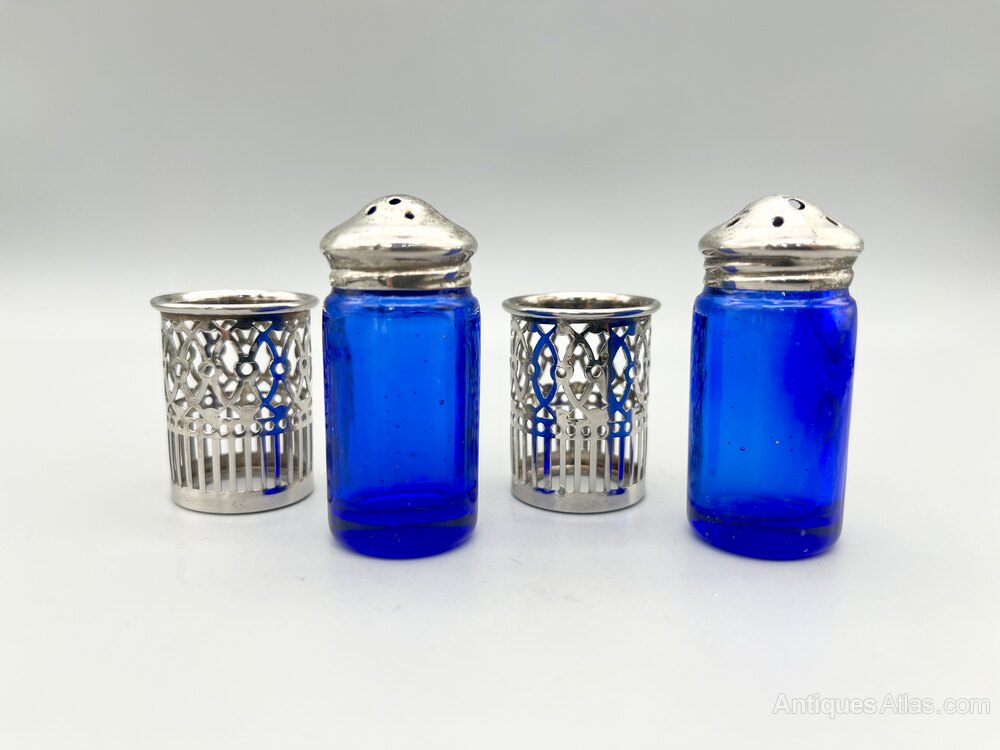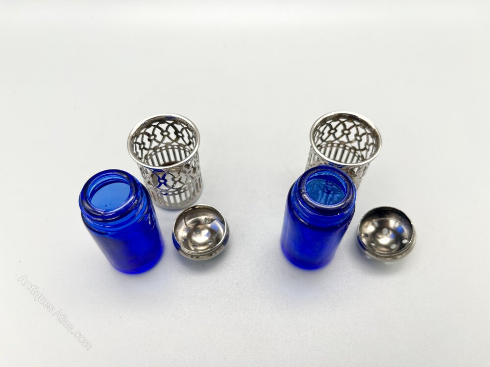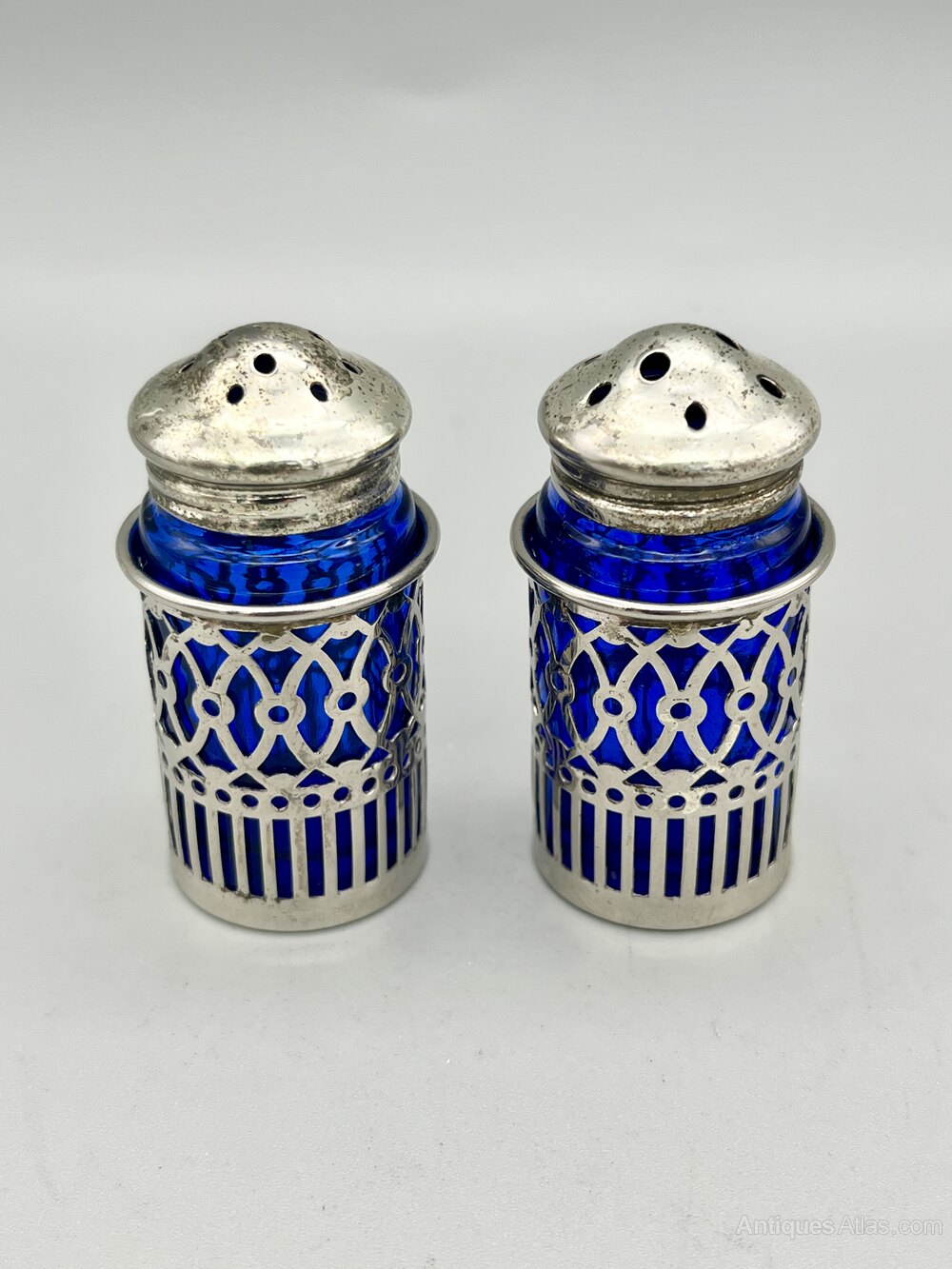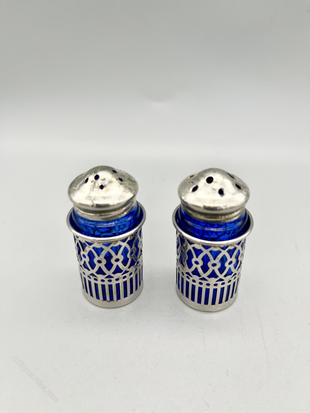 This is an elegant Pair of Early 20th Century Silver Plate Salt & Pepper Shakers. The bodies are blue glass and sit inside cylindrical pierced silver plate holders in the Georgian revival style. The screw tops are silver plated, one with larger holes for salt and the other with smaller holes for ground pepper.