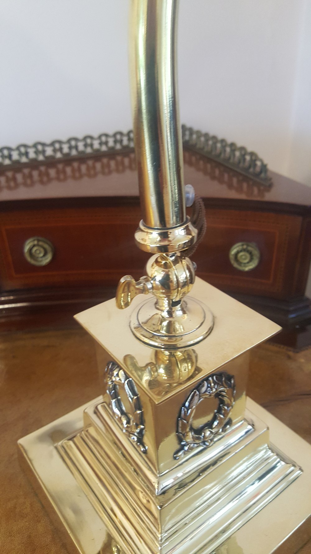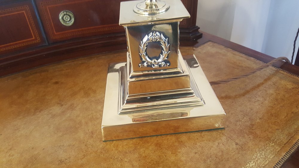 Early 20th century brass adjustable desk lamp on square plinth base with relief laurel wreath decoration 14"w x 6"d x 18"h