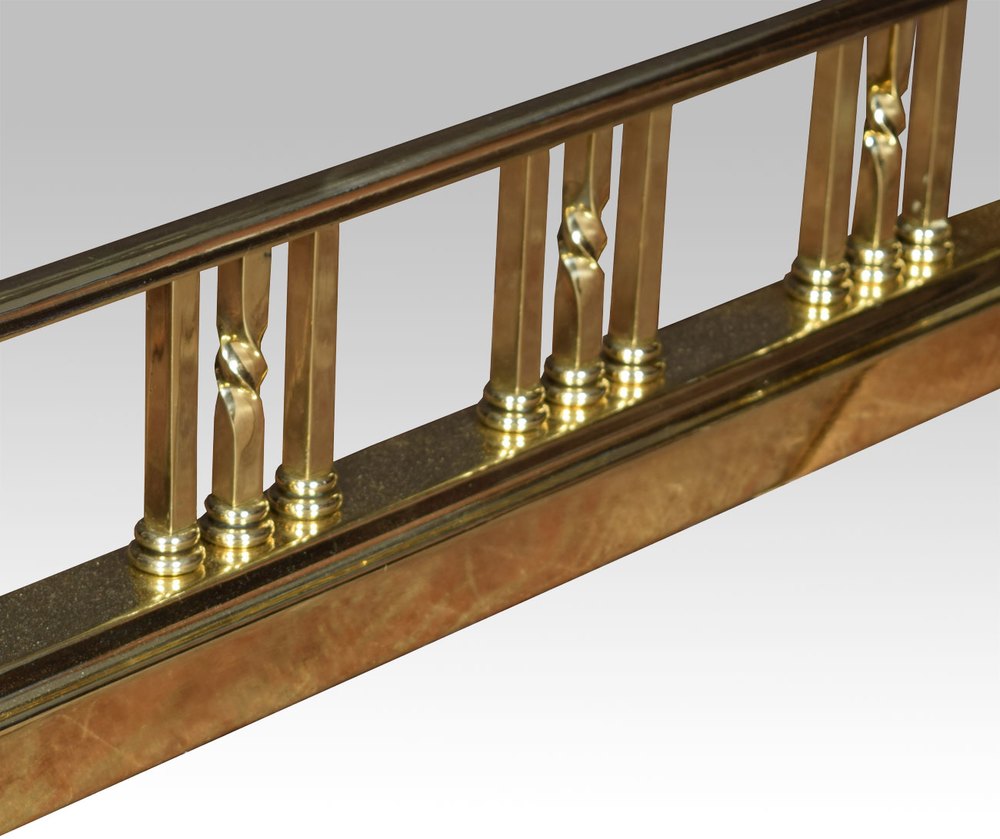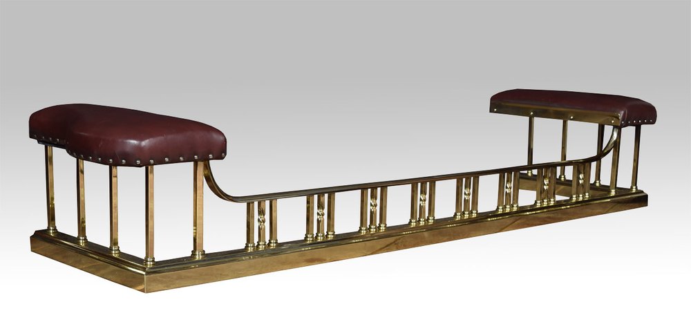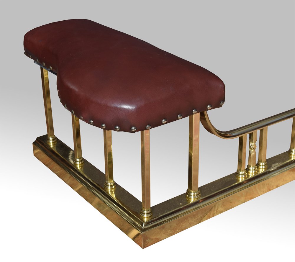 early 20th Century brass club fender, with two seat pads upholstered in dark red leather on decorative square and spiral twist supports.