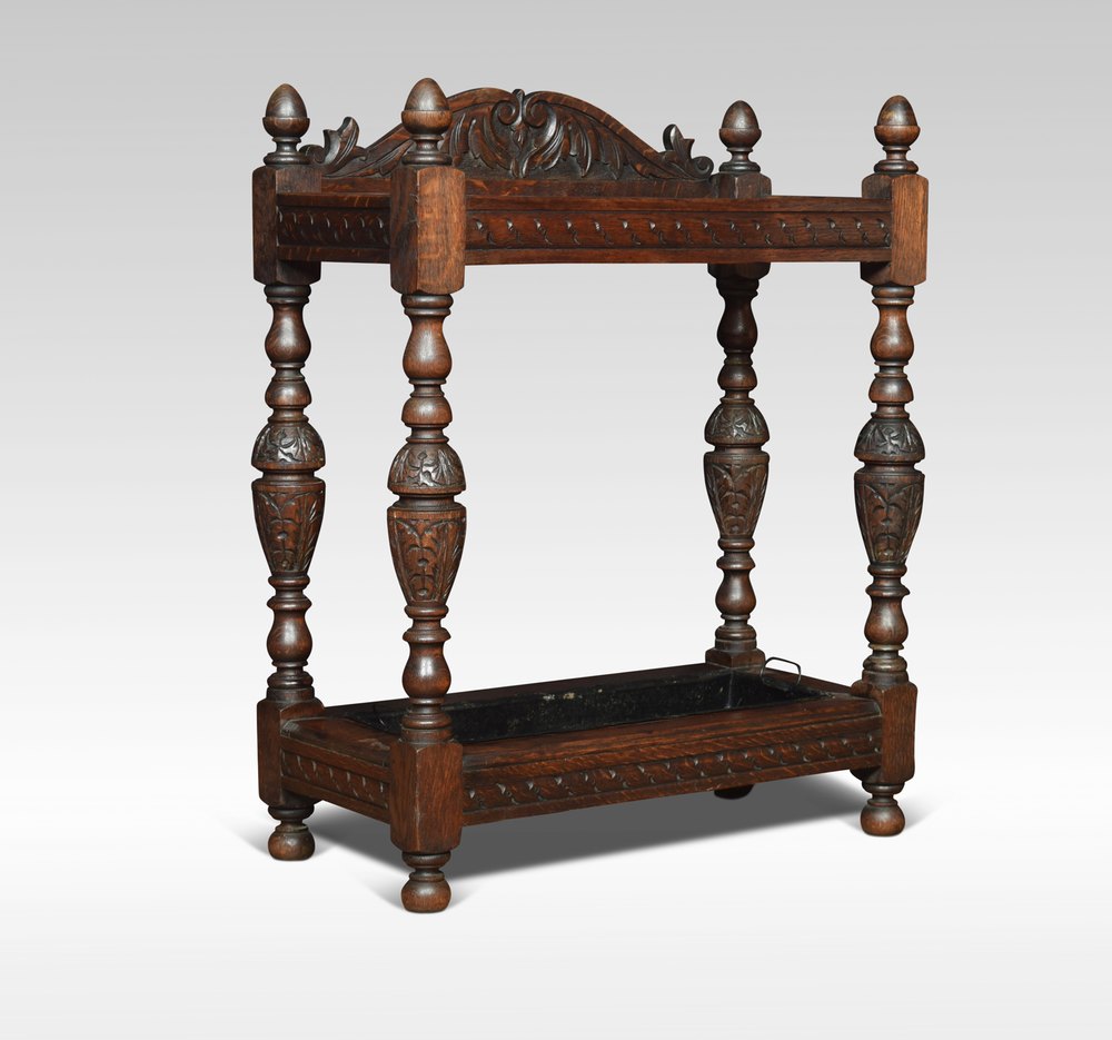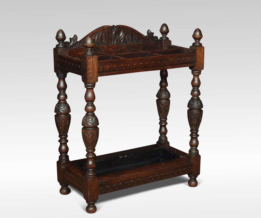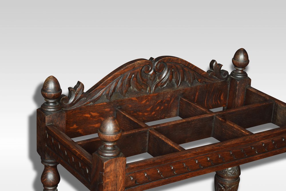 Early 20th century stick or umbrella stand, the carved foliated gallery above six box set dividers, raised up on four turned supports united by under tier with original drip tray.