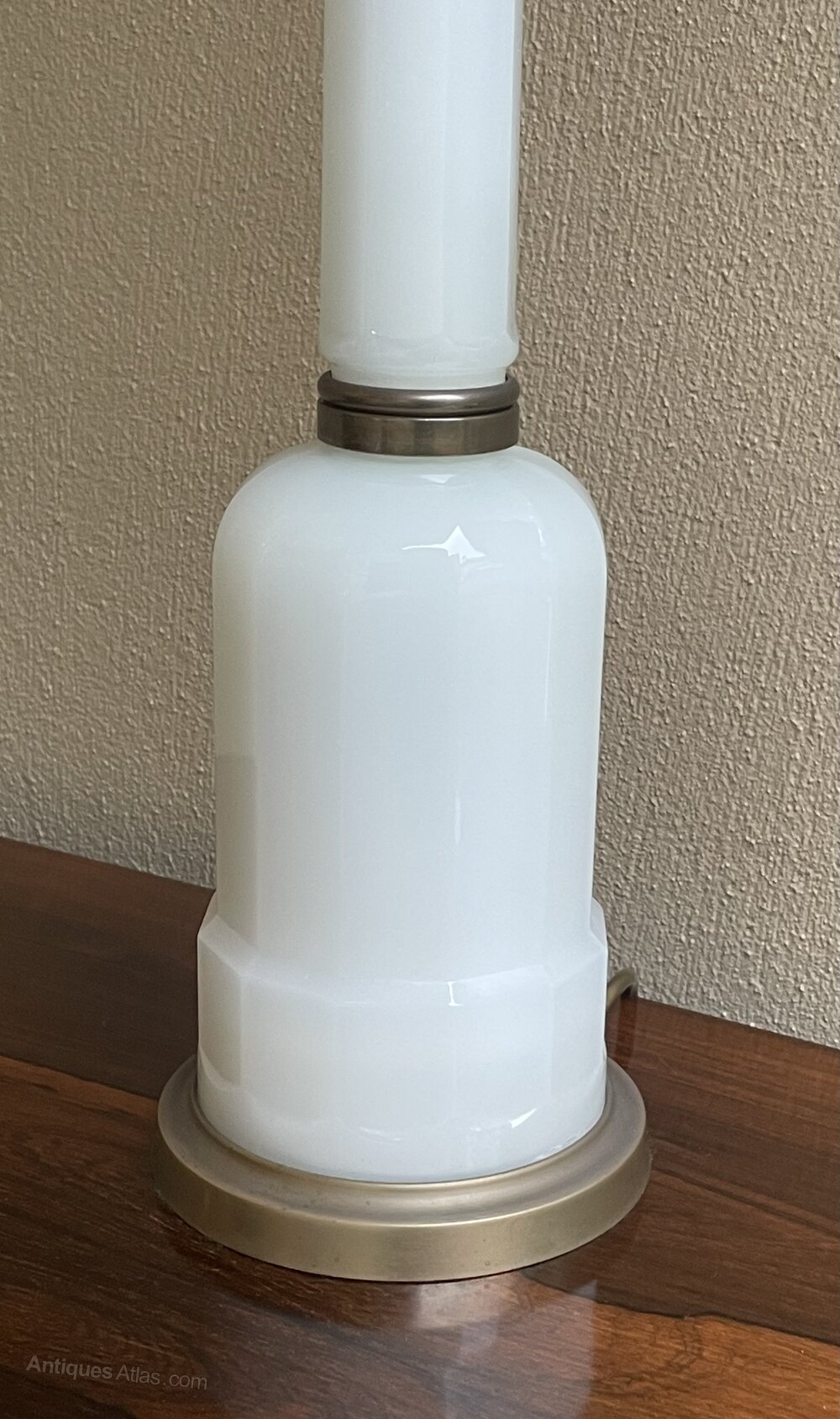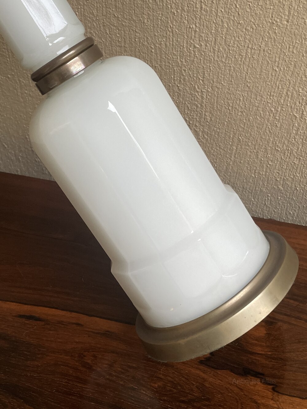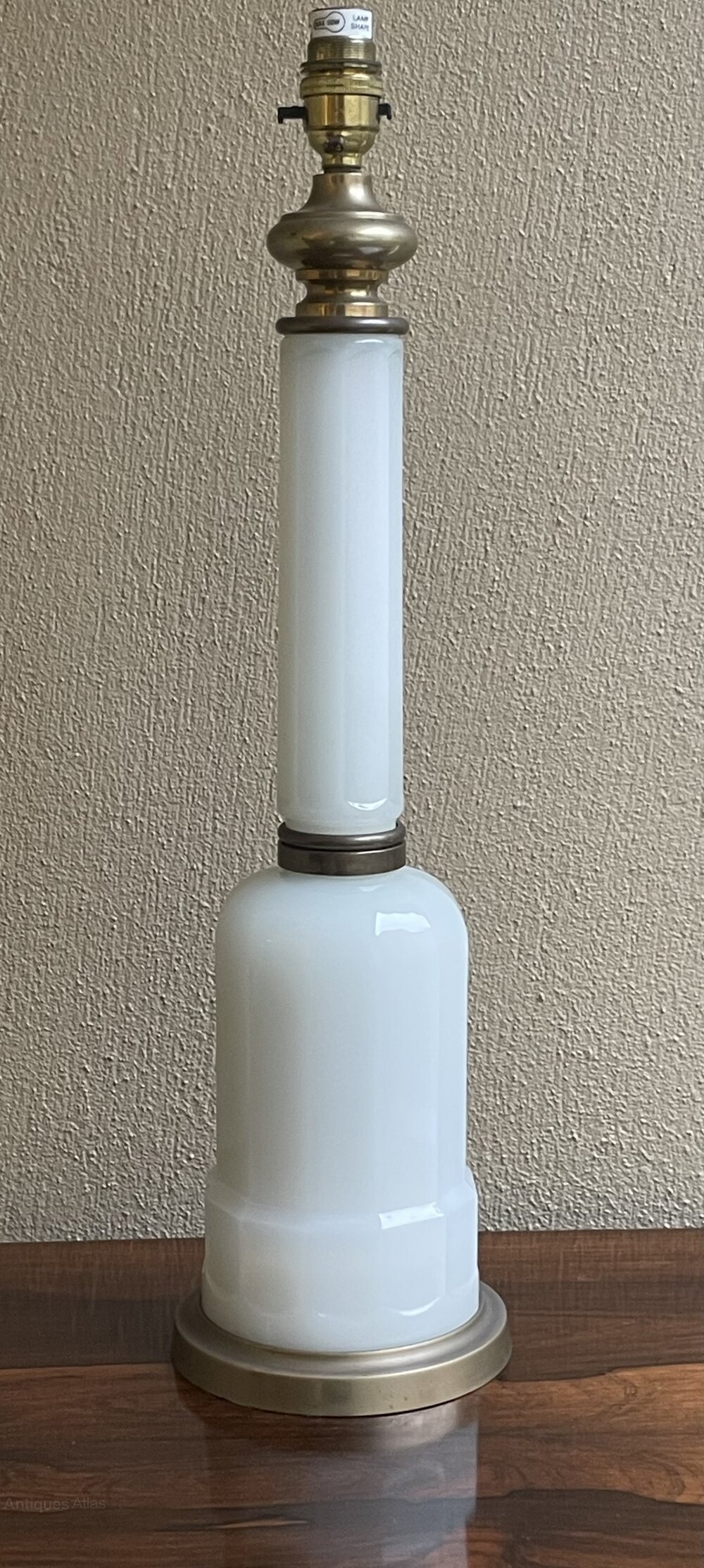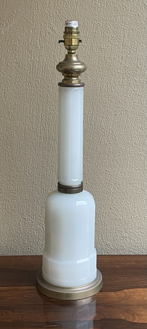 An early 20th century opaline glass and brass table lamp base, on a moulded polygonal stem with gilt brass mounts and base.