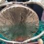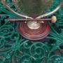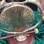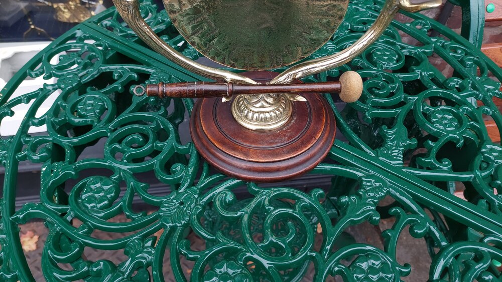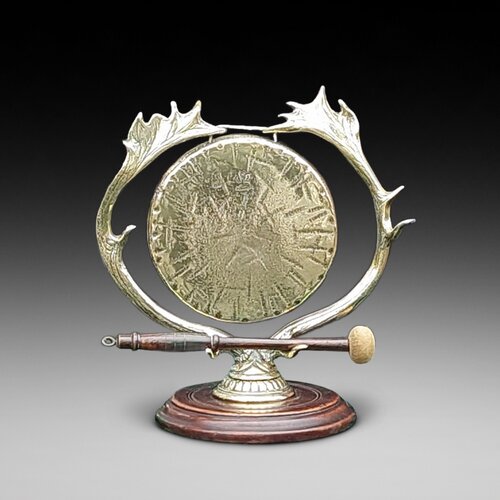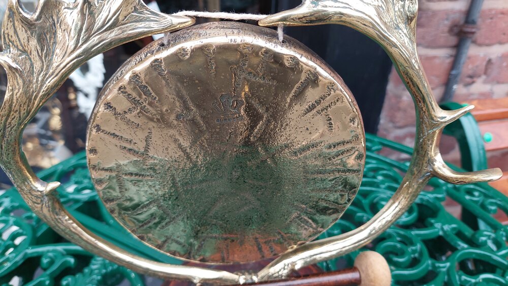Early 20thC Brass & Oak Table Top Gong of Deer Antler Form with Original Beater - 10"w x 5"d x 10"h