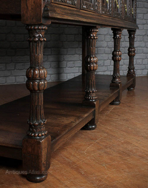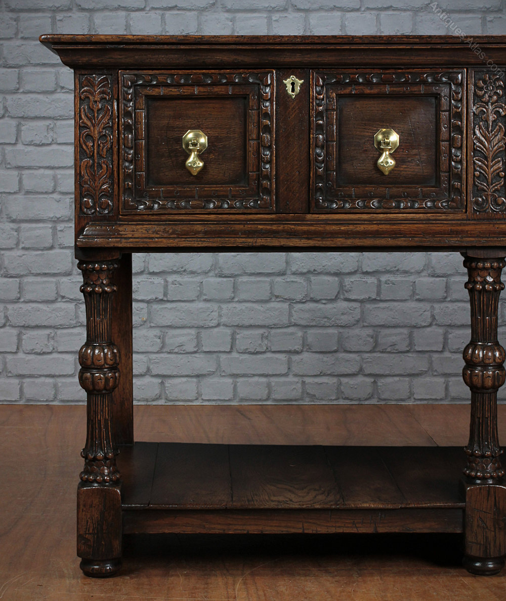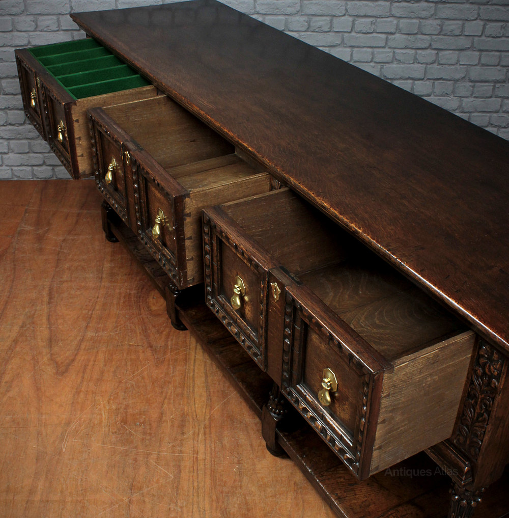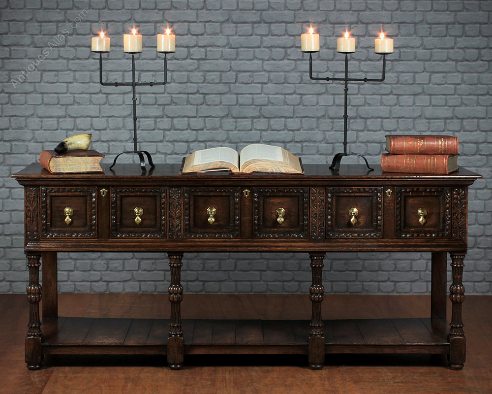 Handsome Early 20th.c. Jacobean Style Open Dresser c.1930. Superb quality, solid oak throughout with a single piece top over three large drawers with carved and panelled drawer fronts and a potboard base. Further carved floral detail between the drawers and raised on exceptional turned, carved and reeded legs. Excellent condition, original brass drop handles.