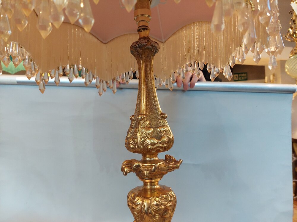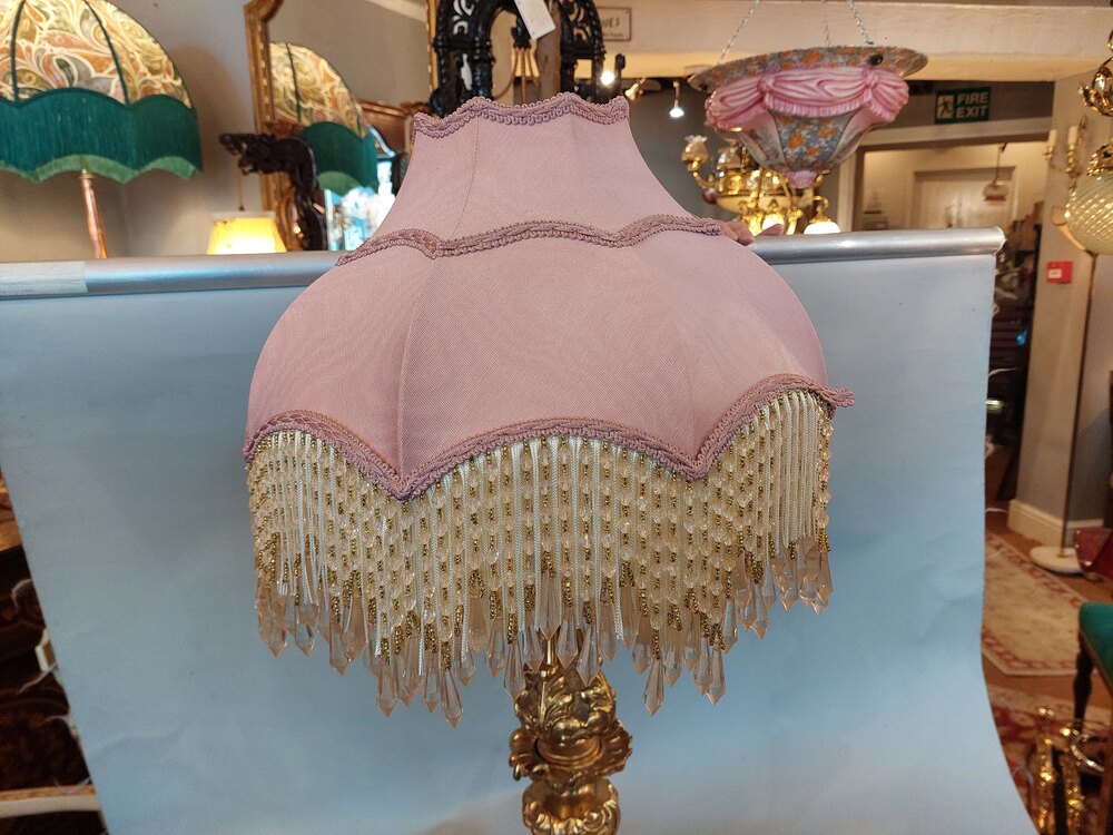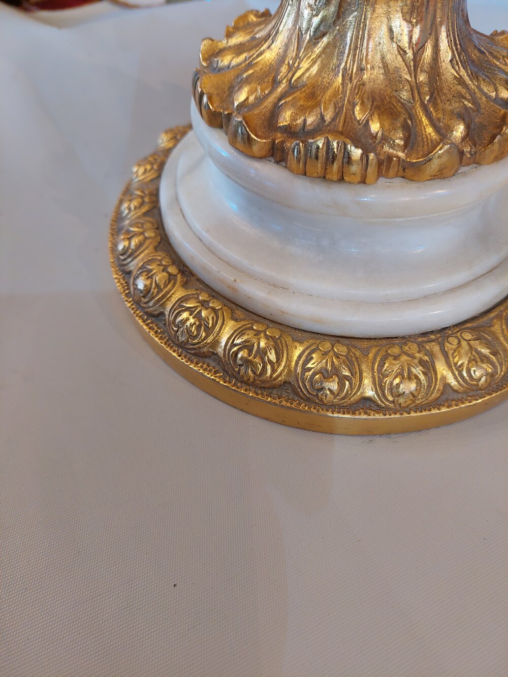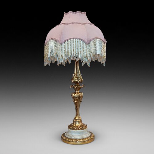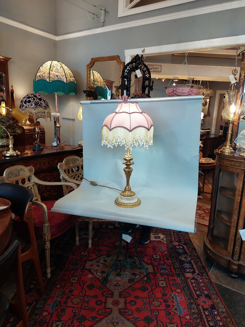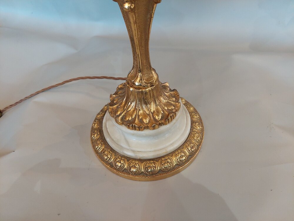 Early 20thC Ormolu and Marble Table Lamp, with leaf moulded decoration - The lampshade(s) are newly handmade silks by the same maker as provides the shades for Downton Abbey - all lights and lamps have been rewired with authentic corded flex, fitted with either foot switch or finger clicker switch and are Pat tested