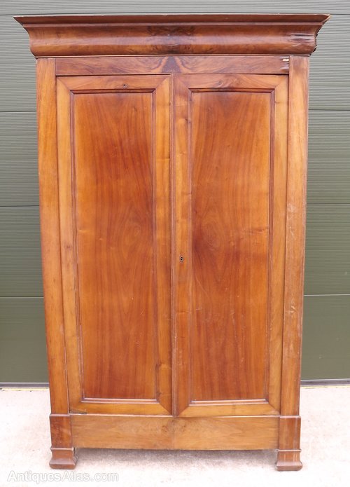 This antique armoire dates from the early twentieth century, and we believe it to be of continental origins. It is made from what we believe to be some type of fruitwood, some solid, some veneered over solid wood. Please note that the armoire does have some alteration and damage and would benefit from some restoration work. It has double doors which open to reveal a hanging section - this is a later alteration as the armoire would originally have been shelved. Beneath the hanging section inside is a shelf with two small drawers beneath, and beneath this is an open gap. One of the small drawers has a small turned wooden handle and the other has a lock. The wardrobe door also retains its lock, but please note that no keys are present. The armoire is supported on shaped feet at the front and square legs at the back. The piece can be dismantled for ease of transportation.