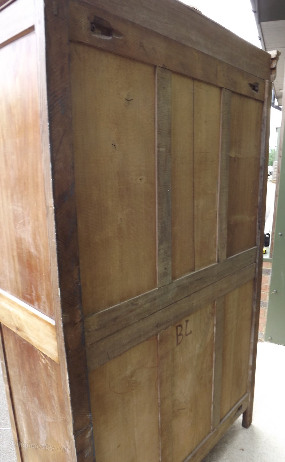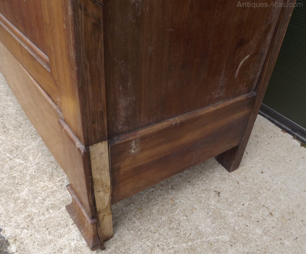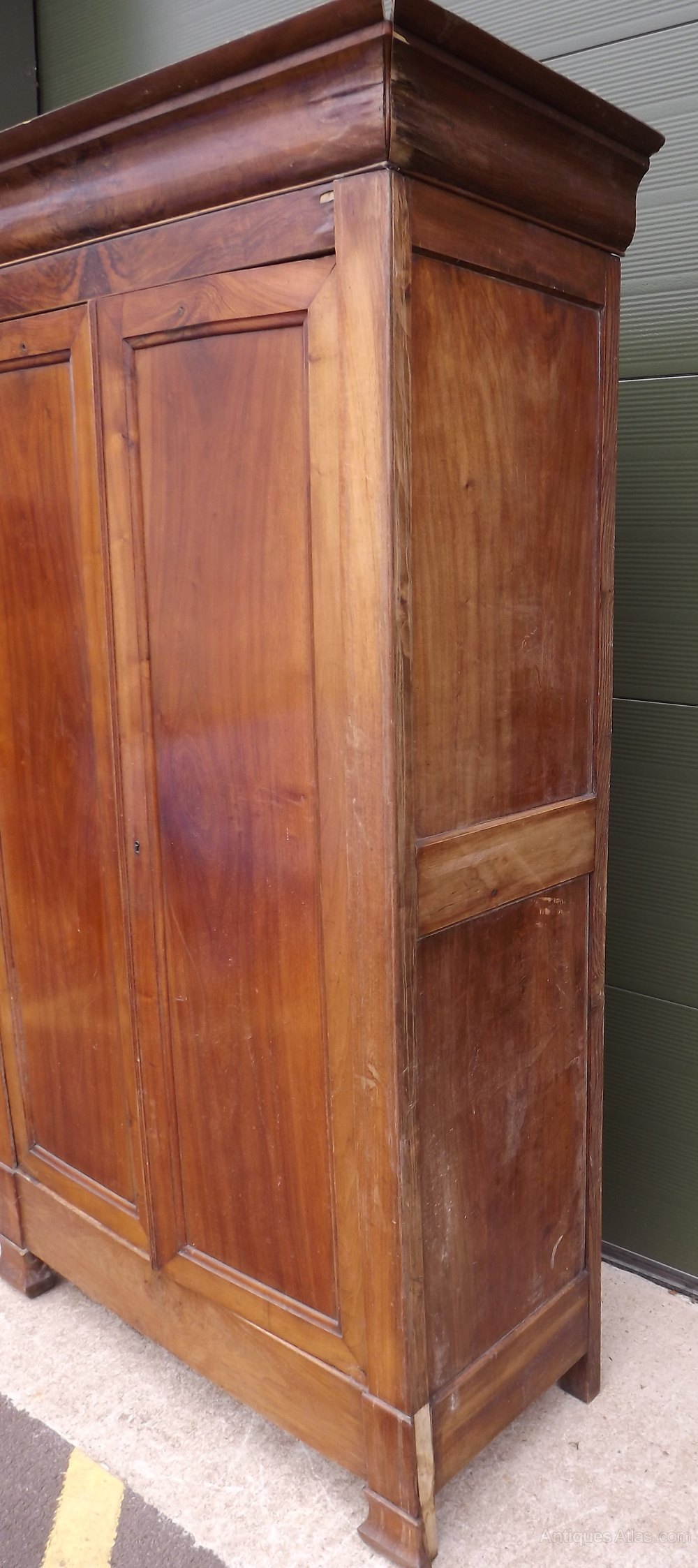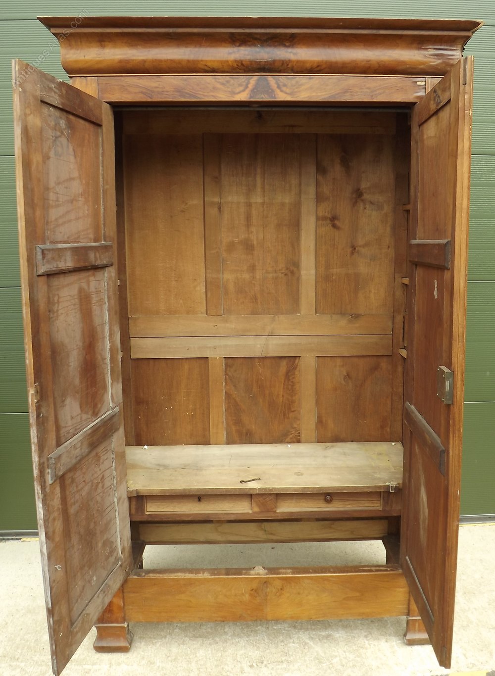 Condition: Overall this piece is in basic usuable condition , but does need some restoration work. It has been altered and repaired over the years and the original shelves are missing. The hanging rail is a more recent addition. There is no base to the piece. There is some heavy scuffing and wear to the woodwork with some wood loss in places and the piece is overall faded. One of the top front corners has some significant water damage - the veneers are lifted and the blocks at the top which hold the retaining bolt have disintegrated and require replacement. There is a piece of moulding detached from one side - this is present. One of the wardrobe doors is bowed. There are some signs of old woodworm damage - this has been treated.