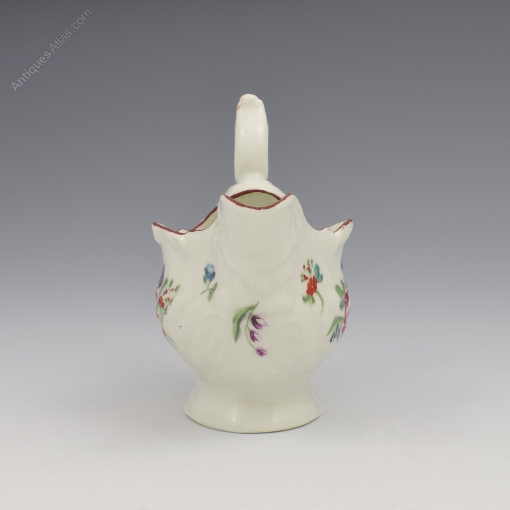 A pretty 18th century Derby porcelain press moulded cream jug of "dolphin ewer" form. Nice, crisp shell moulding, shaped rim and double scrolled handle with kicked up thumb rest. Beautifully painted with sprays of garden flowers in lovely, bright enamels: orange red, turquoise, pink, purple, yellow, green and blue and finished with a red-brown rim. c.1760.