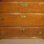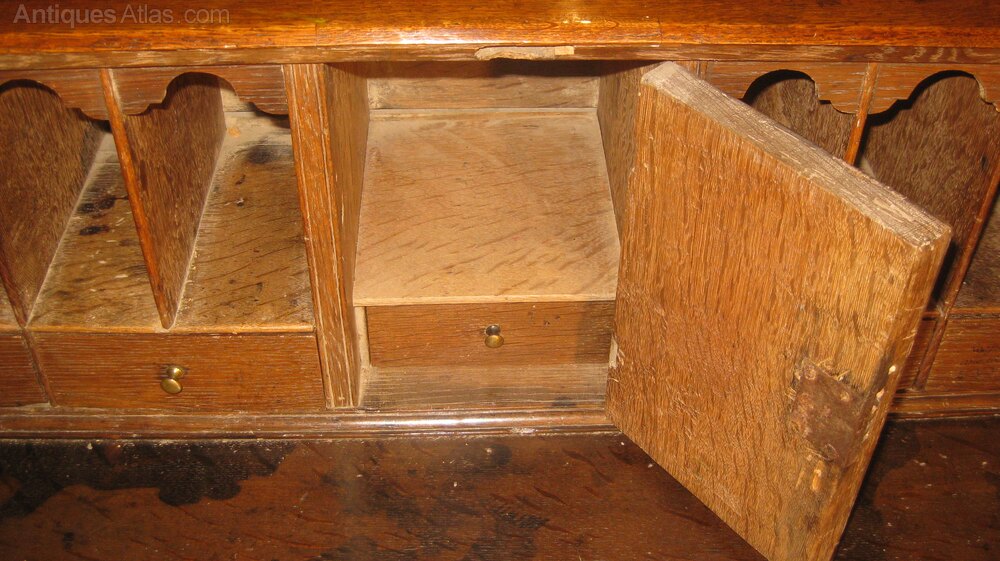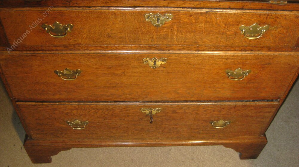 Early Georgian solid oak bureau. The locking fall opening to reveal a pretty interior with pigeon holes, small drawers and lockable central door. Below are 3 large drawers of a good, hand cut, dovetailed construction with brass plate handles. Standing on bracket feet.
