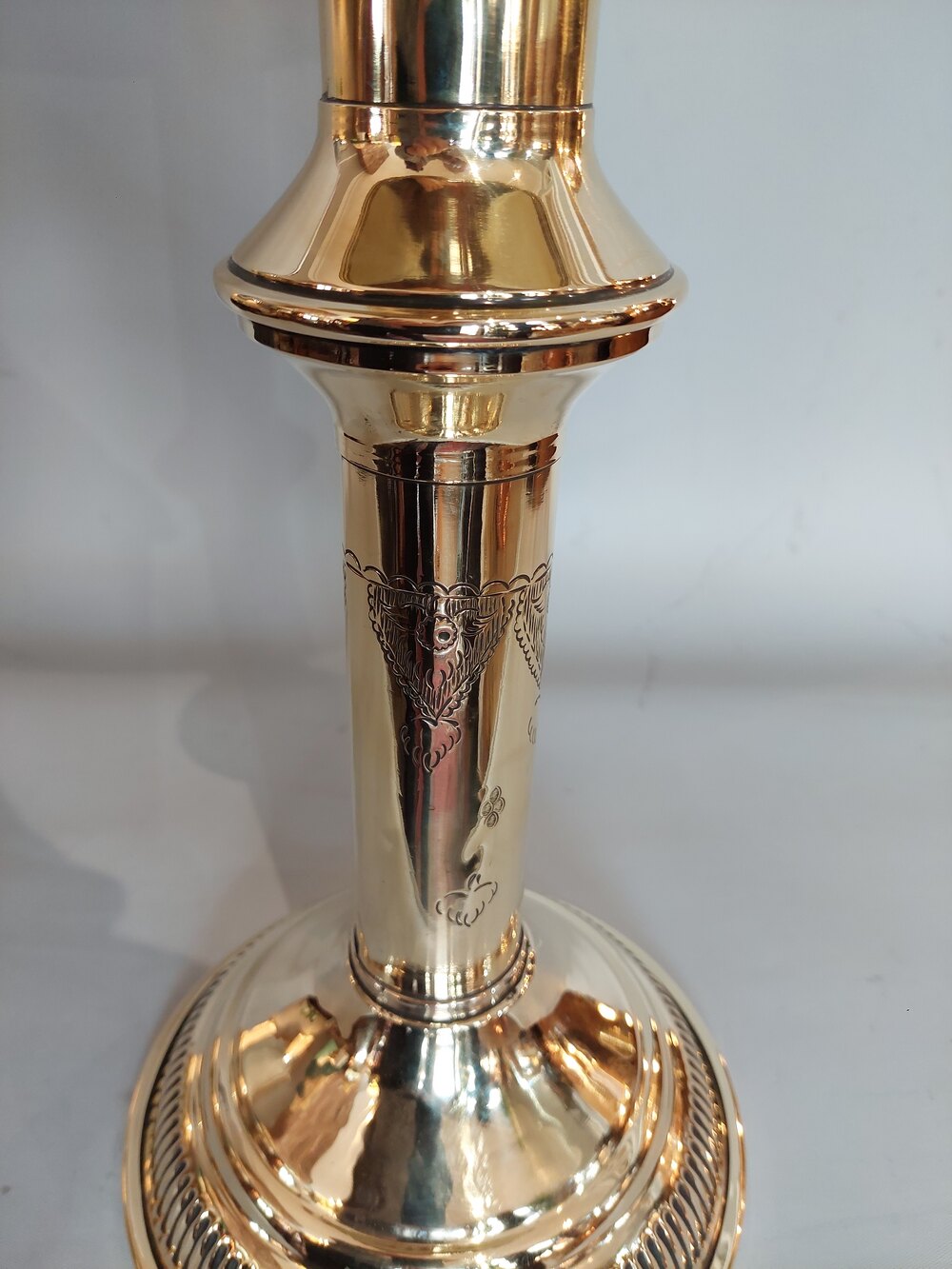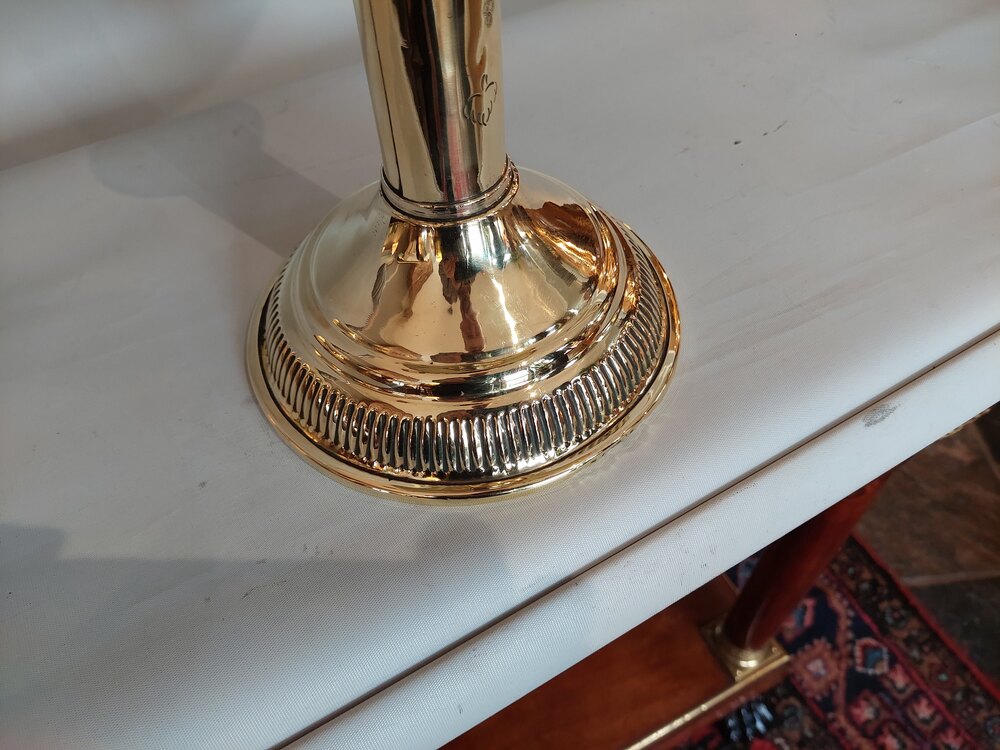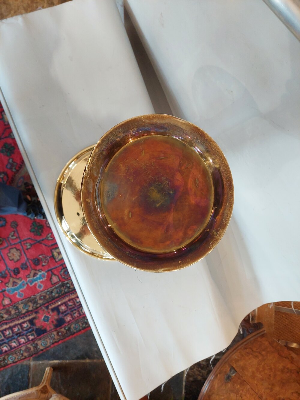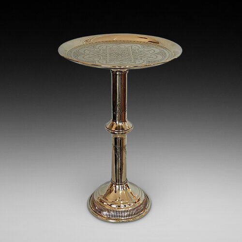 East Asian Decorative Brass Lamp Side Table with decorated pressed top - 13" diam x 19"h