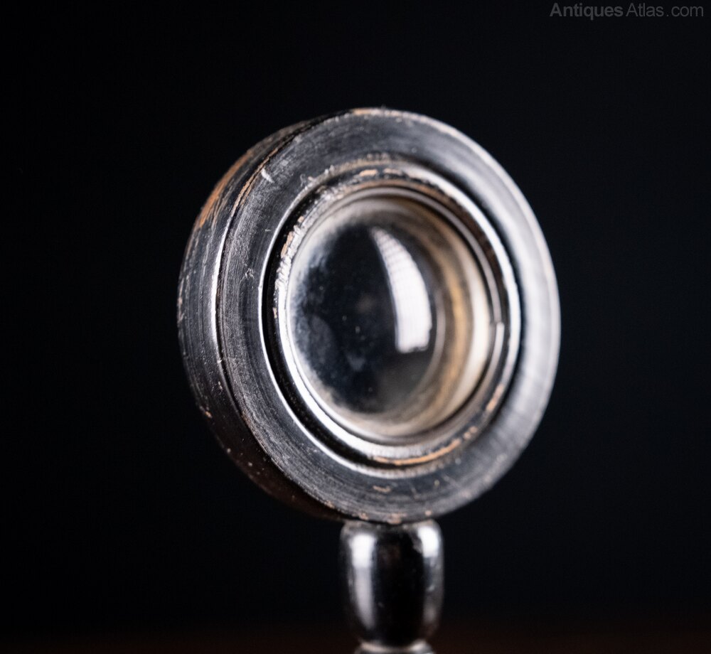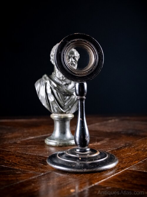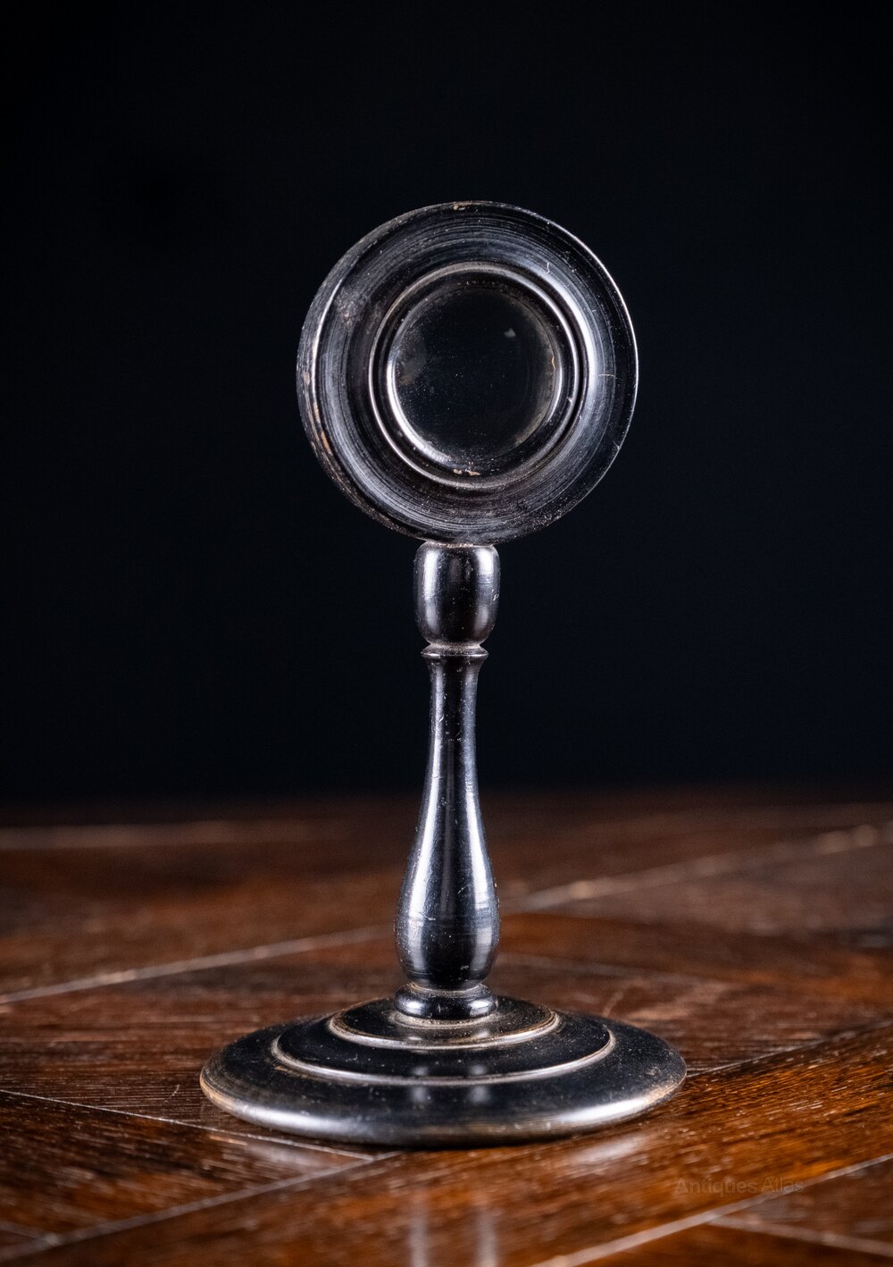 This table top example has a wood-mounted lens upon a turned pillar and base. Light signs of wear commensurate with age. Displays well extremely.